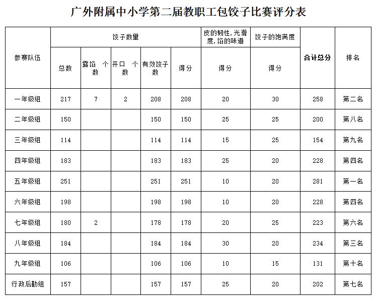 冬至到,包饺子、吃饺子,才够味、够暖。阵阵香气扑鼻而来的饺子交由就餐点厨师对饺子光滑度、饱满度、韧性、味道和数量进行统一评分,最后五年级组、一年级组、八年级组分别获得前3名,其他年级组获得参与奖。
