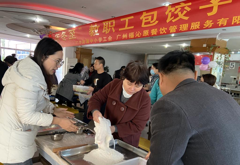 本网讯 12月21日上午,由学校工会主办,广州福沁原餐饮管理服务有限公司承办的庆冬至教职工包饺子比赛在就餐点进行。50多名来自10个年级组的教职工进行了激烈的比拼,大家在动手的乐趣中欢度冬至,一同感受“冬至大如年”的浓厚氛围。