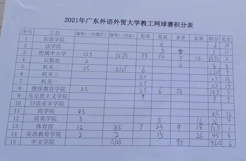 经过一天的奋战,体育部、附属中小学、教育学院、商英学院、高等继续教育(公开)学院、中文学院、马克思主义学院、后勤处和机关二分别获得了团体总积分1-9名。