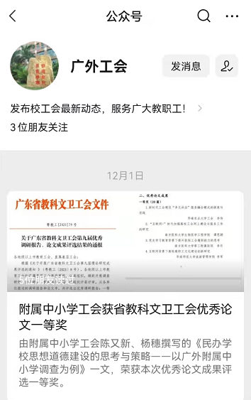 广外工会:附属中小学工会获省教科文卫工会优秀论文一等奖https://mp.weixin.qq.com/s/WuQl3olC6LaPolOrB3lCJA