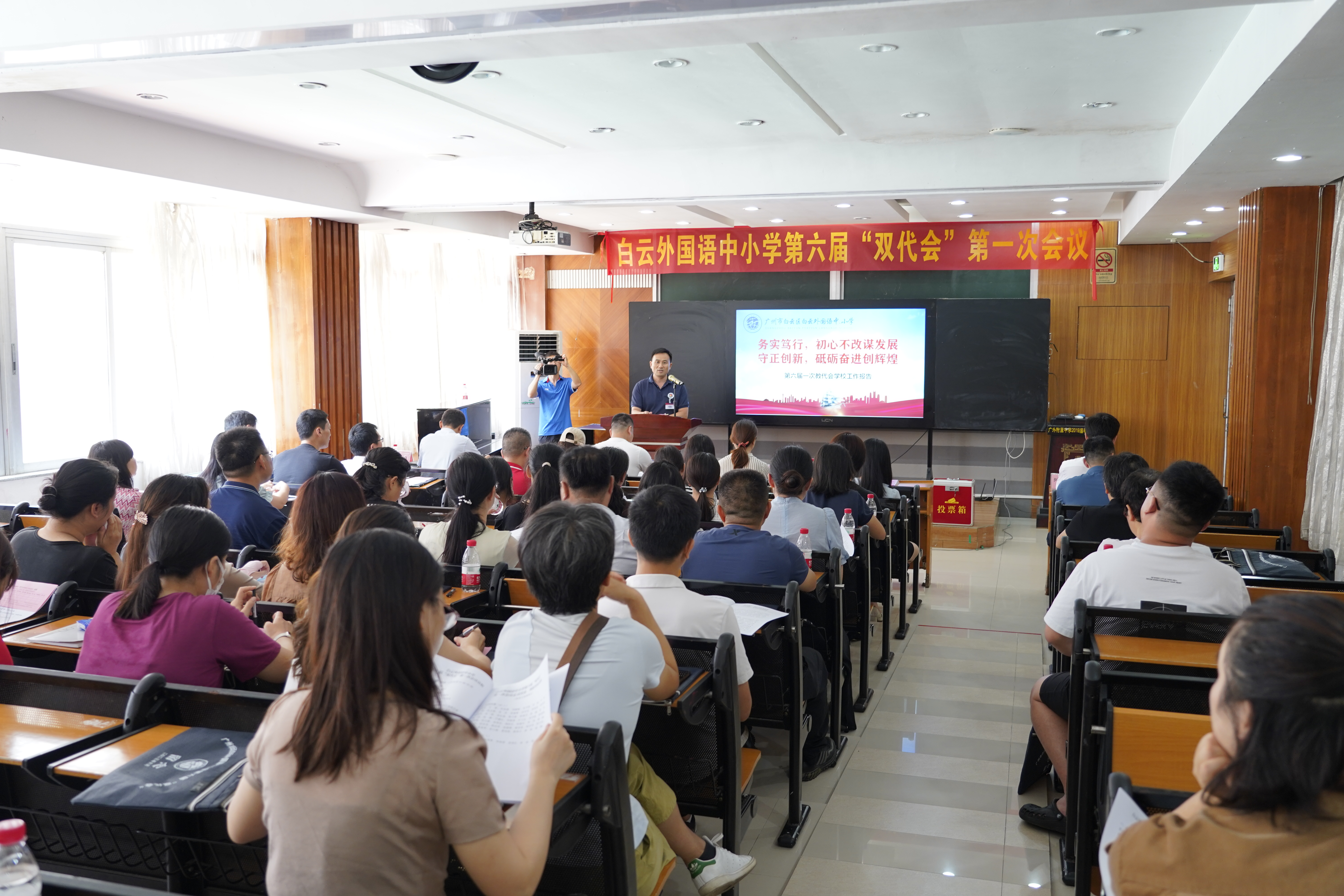 白云外国语中小学第六届“双代会”第一次会议在庄严的国歌声中拉开帷幕。