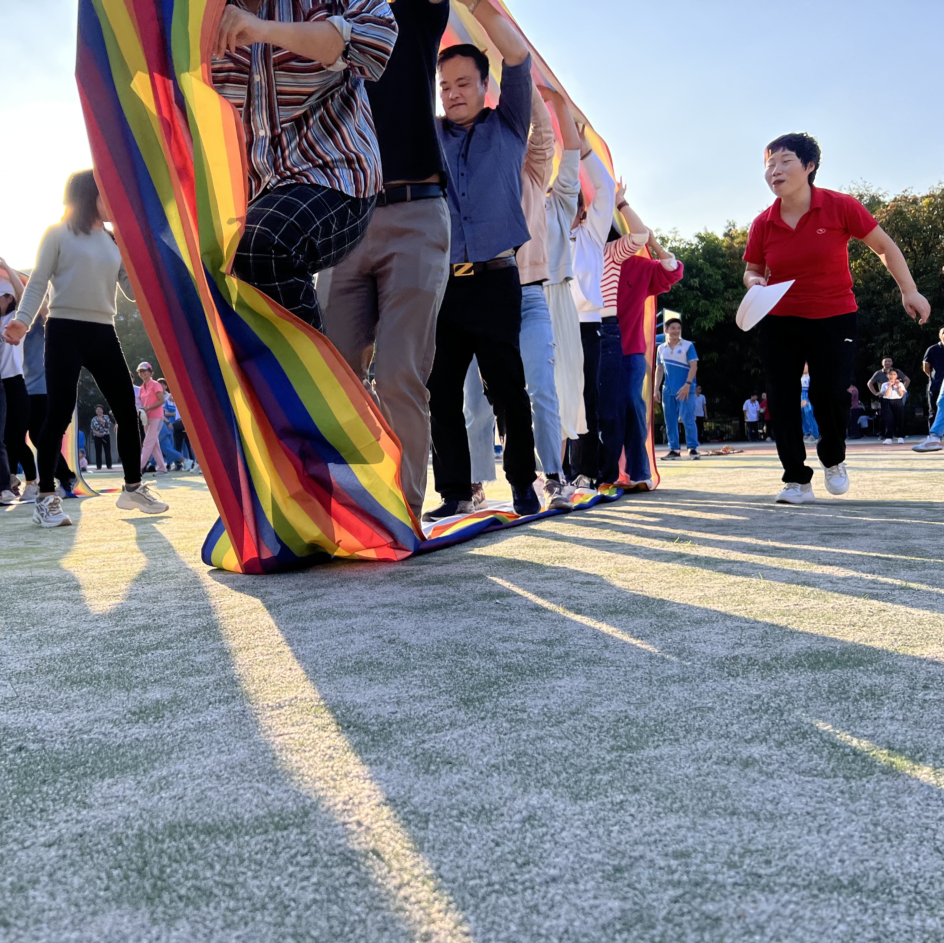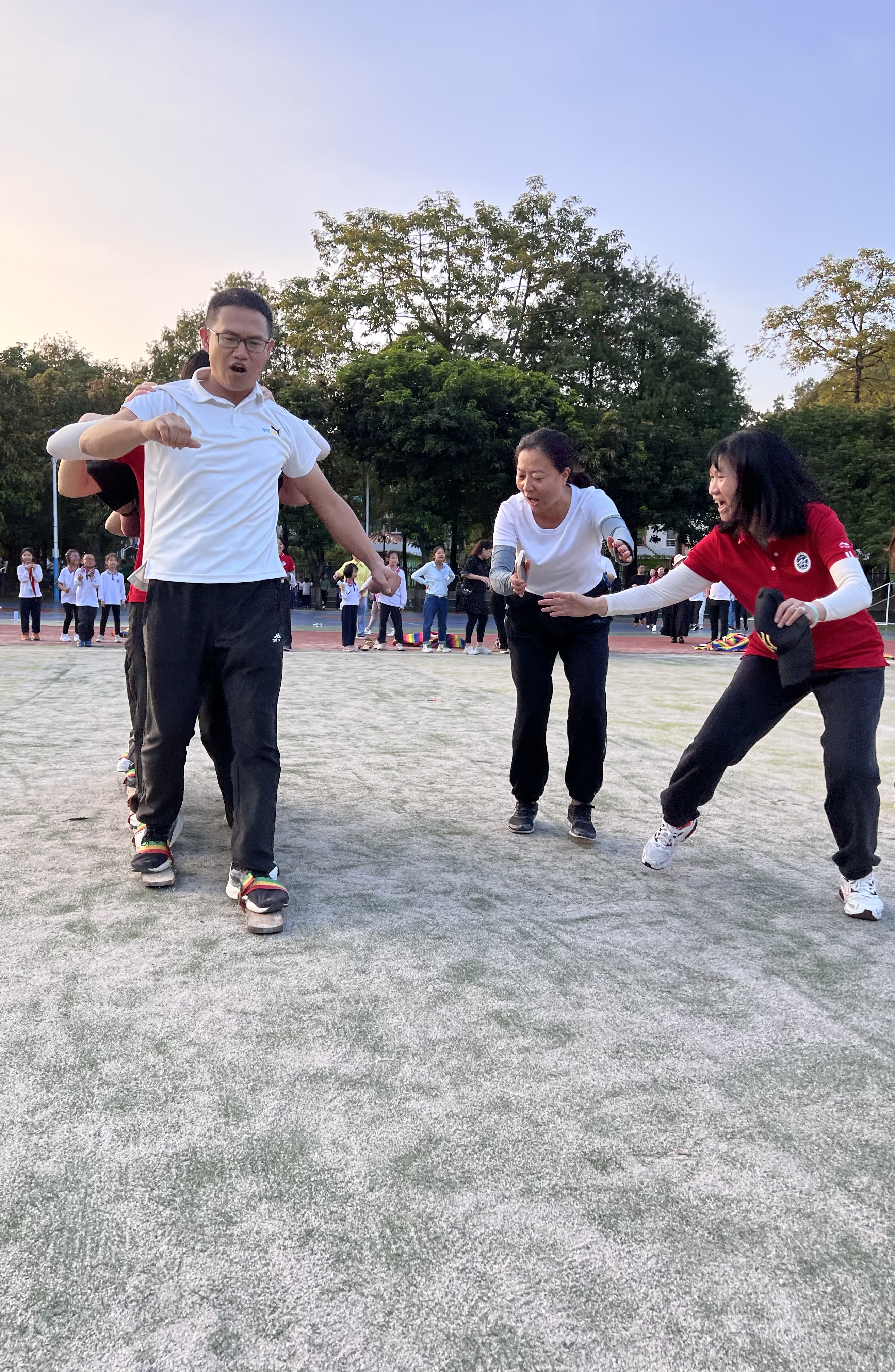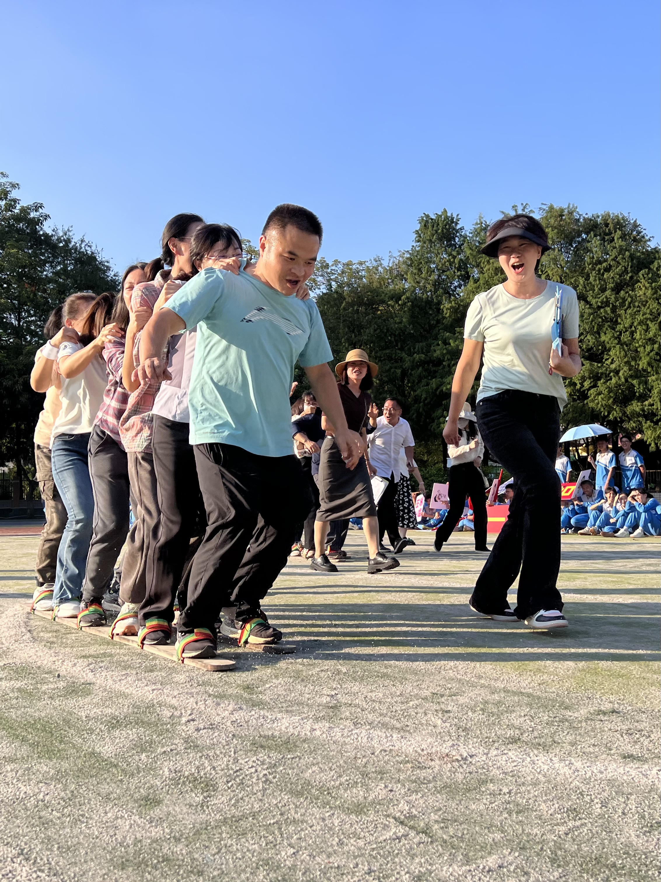“无敌风火轮”项目更是体现速度与激情,裁判员一声哨响,6条风火轮飞速转动,这群“快乐的教书匠”忘记了平日工作的辛劳,挥动着手臂,踩着轻快而统一的步伐,竞相前行,体验着速度与激情的快乐,教职工们矫健的身影也成为了运动场上一道道靓丽的风景线。
