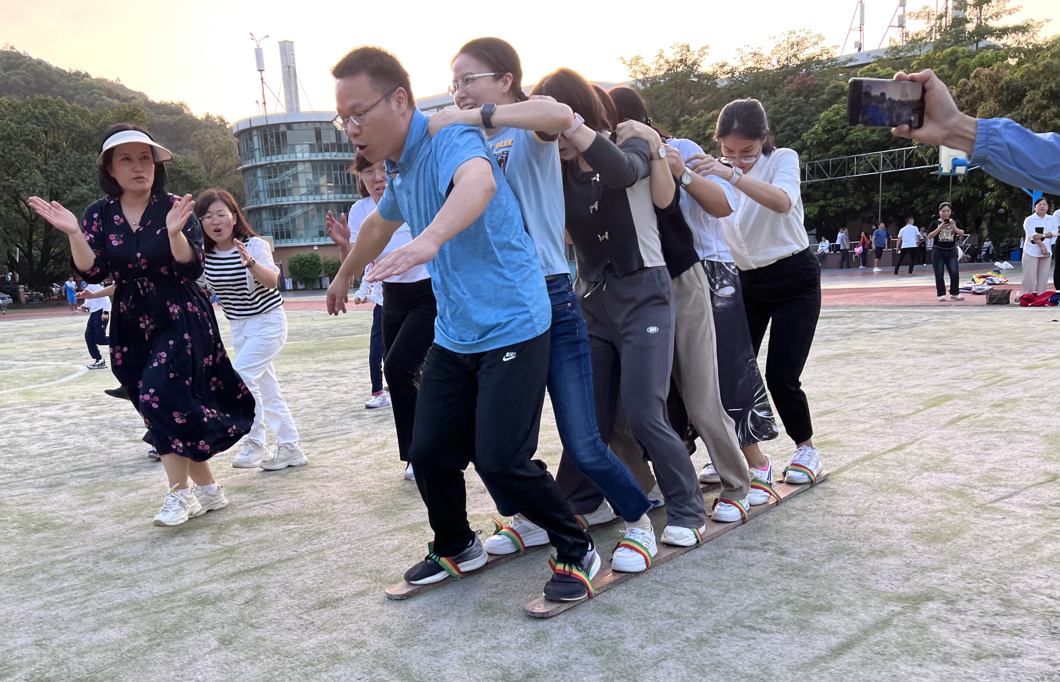 “同舟共济”项目各组1男5女站在有固定带的木板上行进,参赛队员们步伐逐步协调一致,左右摇摆的身姿越跑越快,组织性与纪律性凸显。 “左右,左右……”,大家精诚合作,大声喊着口号迈步向前,速度不相上下,完美地发挥了一样的老师,不一样的风采。