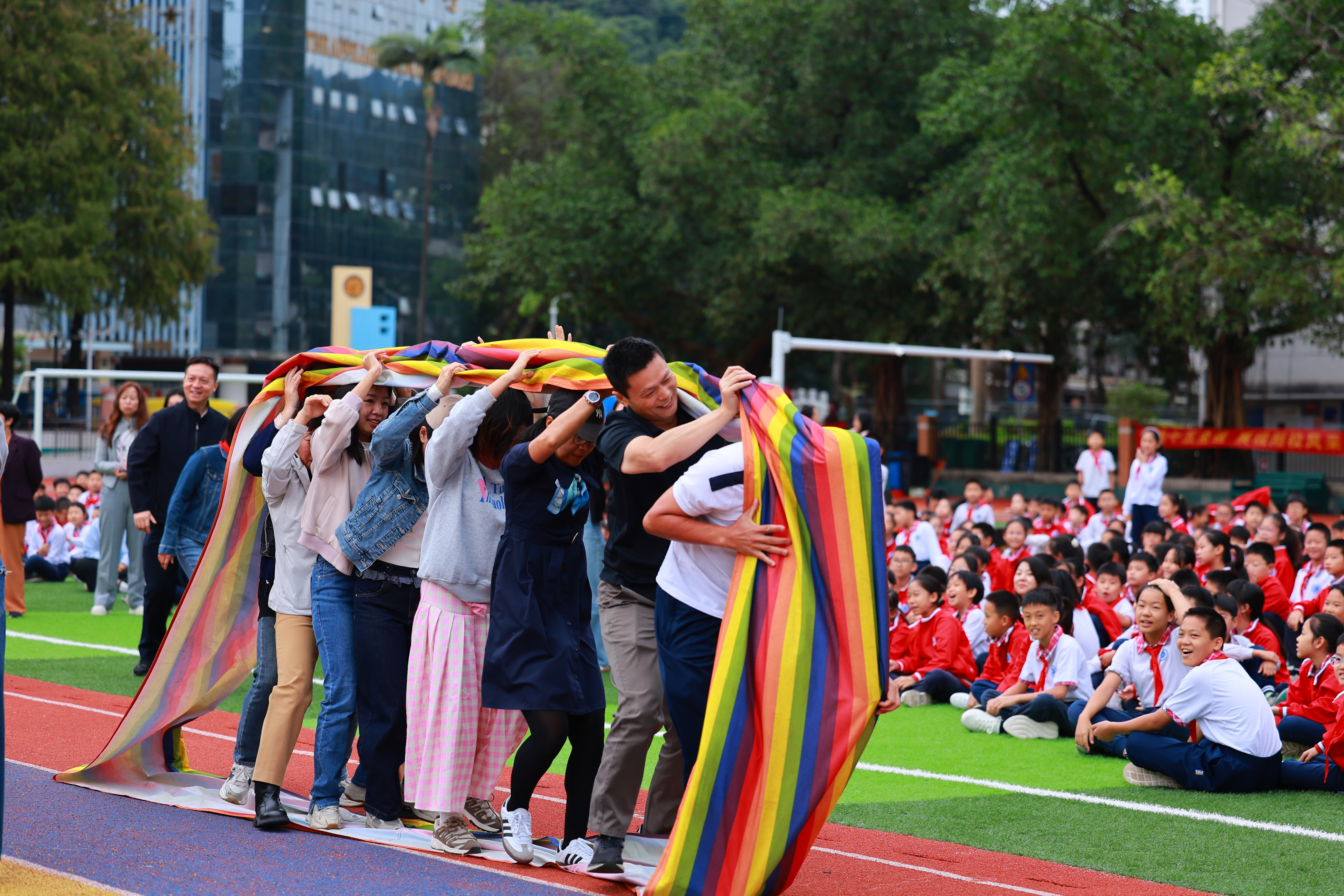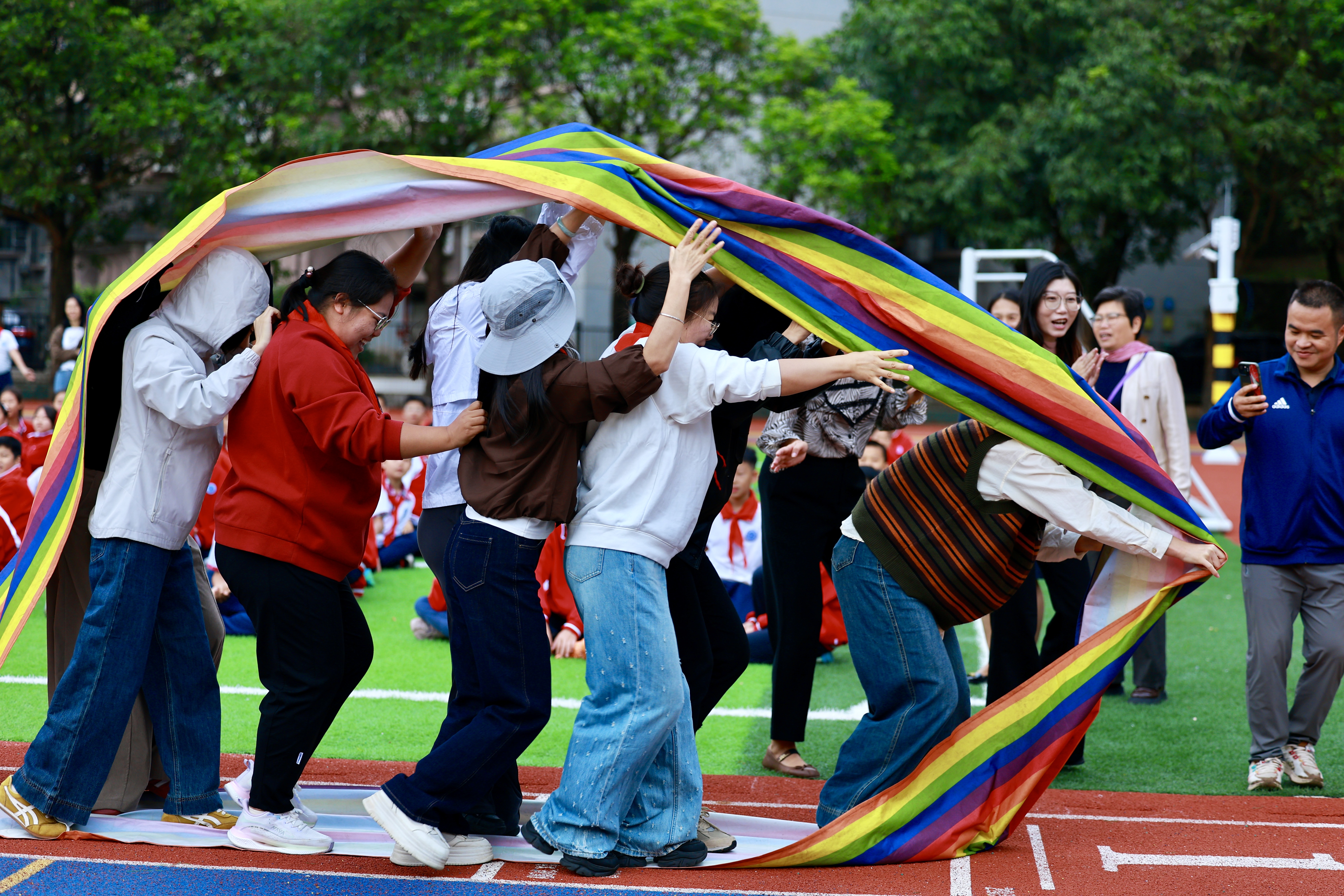 五年级组展现出卓越的团队配合,步伐一致、节奏流畅,宛若施展“同步魔法”,以明显优势摘得桂冠。行政后勤组稳扎稳打,配合默契,从众多强队中脱颖而出,荣获第二名,展现出后勤团队在赛场上的别样风采。七年级组在关键时刻稳住阵脚,把握“速度与平衡”的要义,成功实现反超,将第三名收入囊中,赢得现场阵阵掌声。