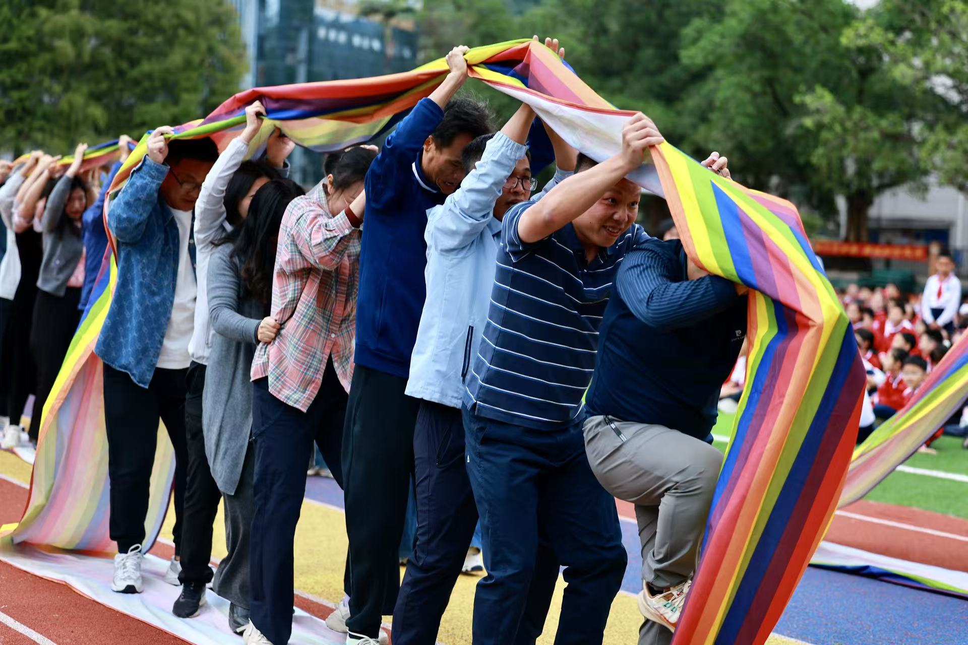 随着方建军校长发令声响,跑道瞬间化作“滚筒舞台”:有的队伍口号统一,如电动履带般平稳前行;有的在加速中稍显偏离,又迅速协作调整。排头教师目光如炬、引领方向,排尾教师则稳如磐石、维持节奏,八人齐心,仿佛滚筒之中蕴藏着一台精密的“同步引擎”。场边师生加油声与笑声交织,热情高涨,将赛场气氛推向高潮。