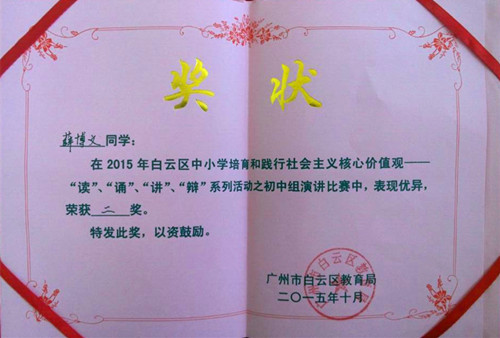 薛博文(左二)参加白云区践行核心价值观演讲活动获奖