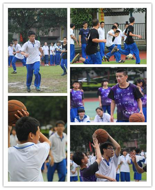 足球场上,一班、三班的选手在草坪上奔跑着,运球、抢球、射门。。。每当自己班射进一个球,观众席上就会传来一片欢呼声;而在篮球场上,选手们同样在激烈的比拼,欢呼声同样不断。。。。。。中途,天公也好像赶来“参加”我们的比赛,即使下起了雨,选手们仍然努力地奔跑,而观众们也始终保持着热情给选手摇旗呐喊;在整个比赛过程中,不管是赛场上,还是场下,都充满了拼搏的呐喊和欢乐,不少选手虽然受了伤,但仍旧露出了开心的笑容。