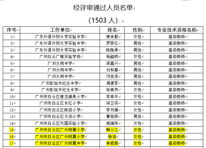经广州市中小学高级教师任职资格评审委员会评审通过,下列同志拟取得高级专业技术资格,现予公示。若对下列同志取得资格有异议,请电话或书面向高级专业技术资格评审委员会办公室或人事职改部门反映,反映情况的电话和书面材料要自报或签署(手写)真实姓名,不报或不签署真实姓名的,一律不予受理。