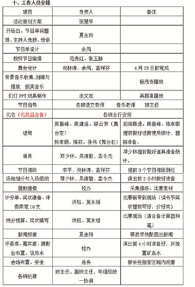 1、 各位语文老师精心准备、提前排练节目。节目编排要突出语言特色,展示学生才艺,精益求精。