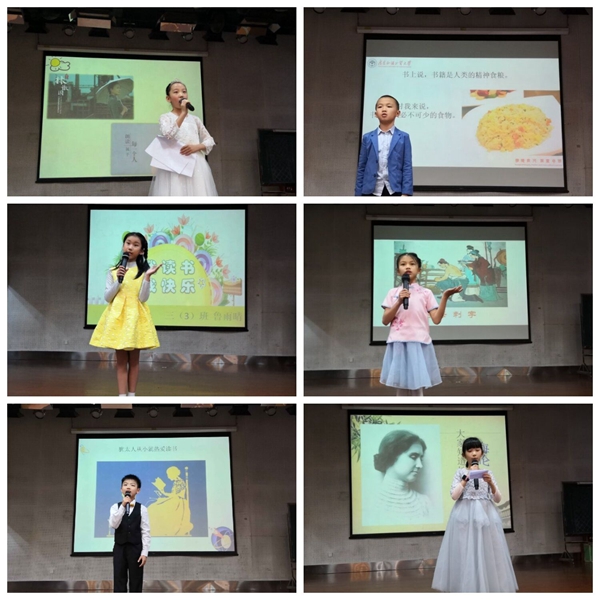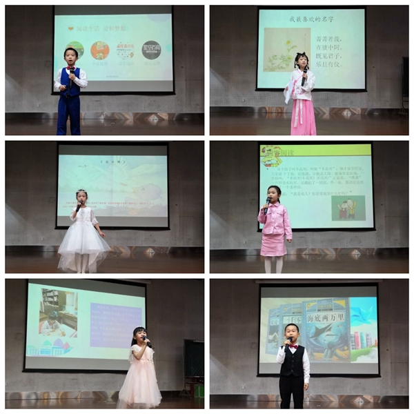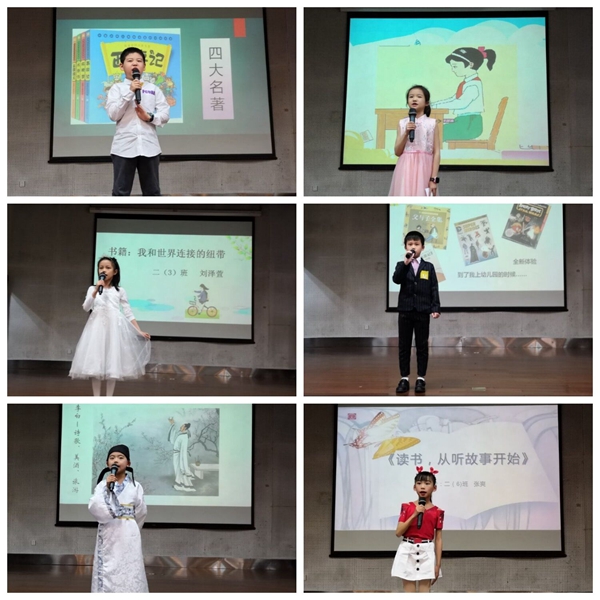 在大家观看了“热身”小短片——《神奇的飞书》后,大赛正式开始。首先是三年级的六位选手为大家讲述他们的读书故事,可谓是精彩纷呈。从小就喜欢阅读,总喜欢与图书相伴的程曦;在读书过程中善于思考,总能发现书中“乾坤”的刘格墨;与书中主人公一同畅游在想象的王国,迫不及待来一场惊险刺激的星际之旅的雨晴;“小书迷”昕瑜;为海伦的坚强而动容的怡萱;还有擅长调动多感官阅读的聿杰,他们独特的故事,以及他们或娓娓道来或活泼俏皮的讲述,都给大家留下了深刻的印象。