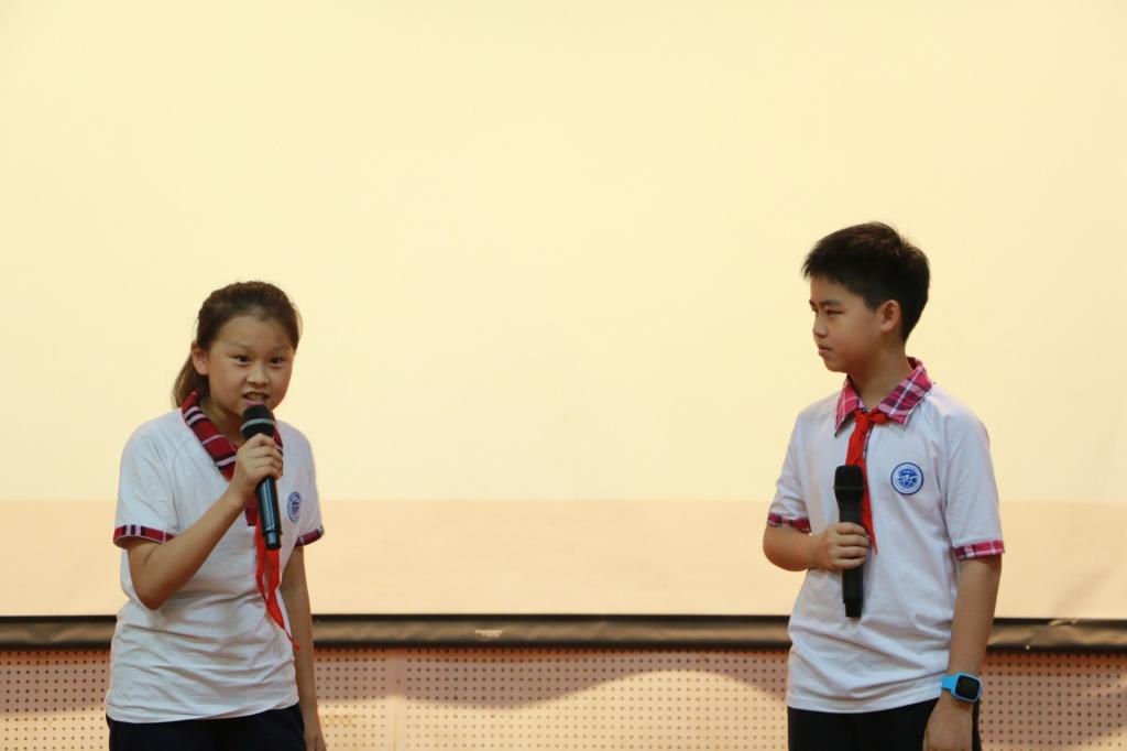 随后,五年级学生代表梁家华、张舟涵表演了简短的校园短相声《拇指和食指》,生动地演绎了家庭教育的现象,引起了家长的思考。