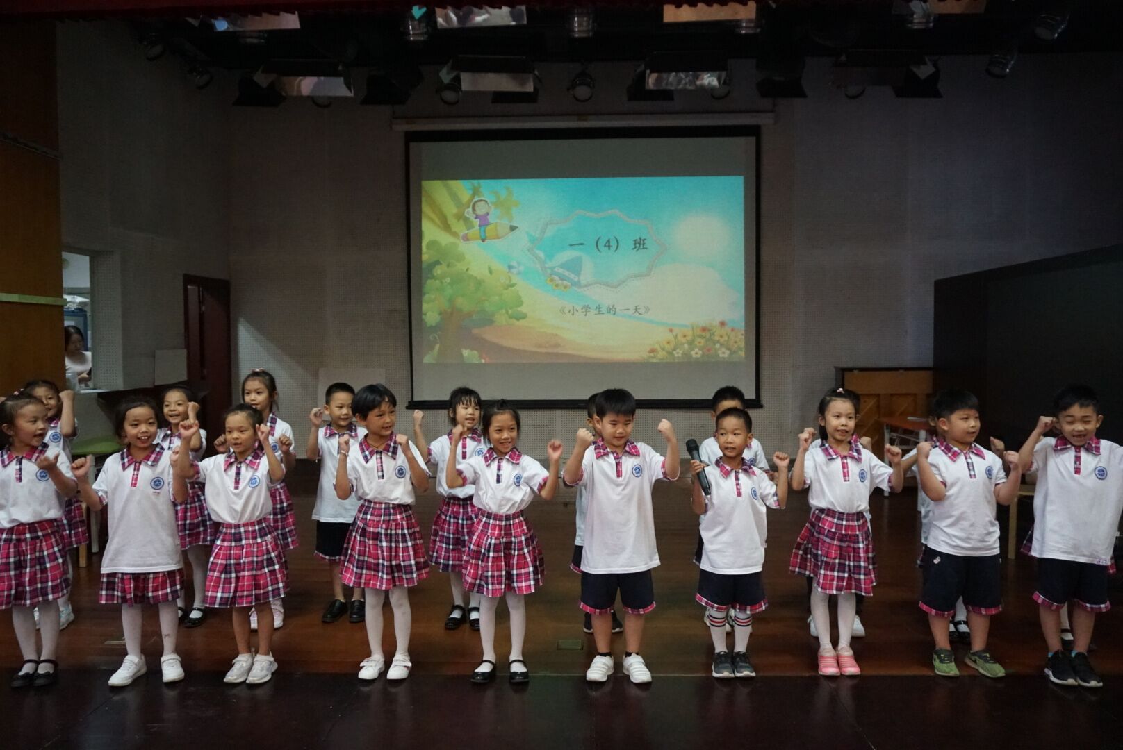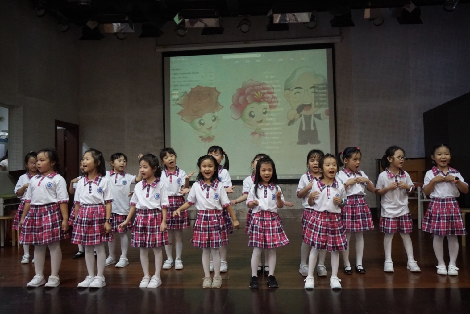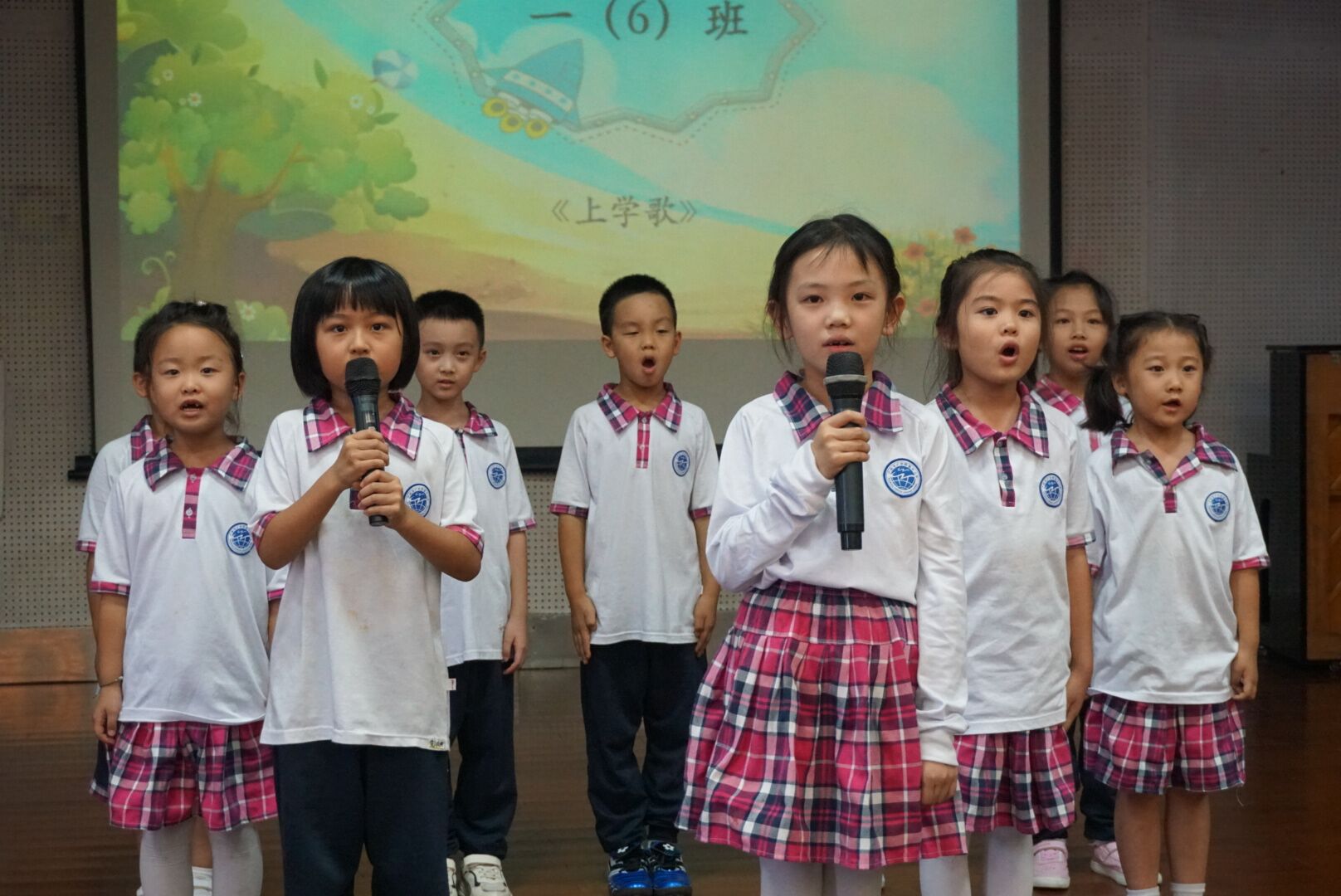 太阳照,花儿笑,—六班的同学给大家带来了耳熟能详的《上学歌》。
