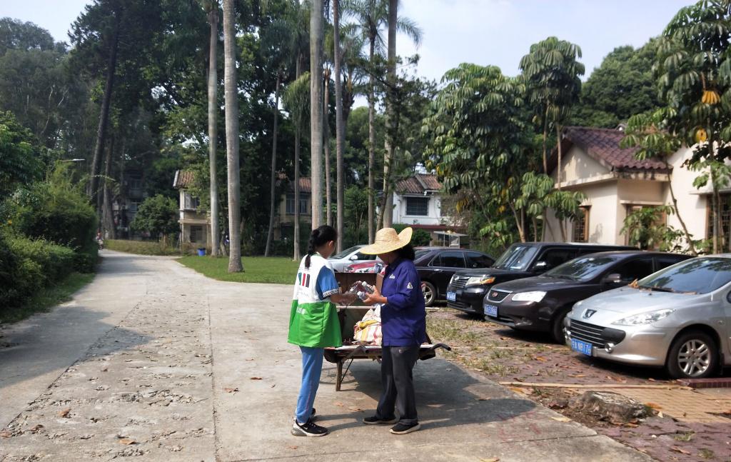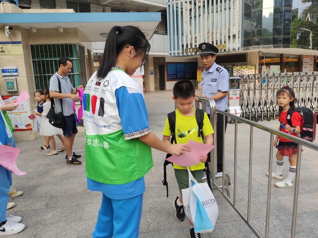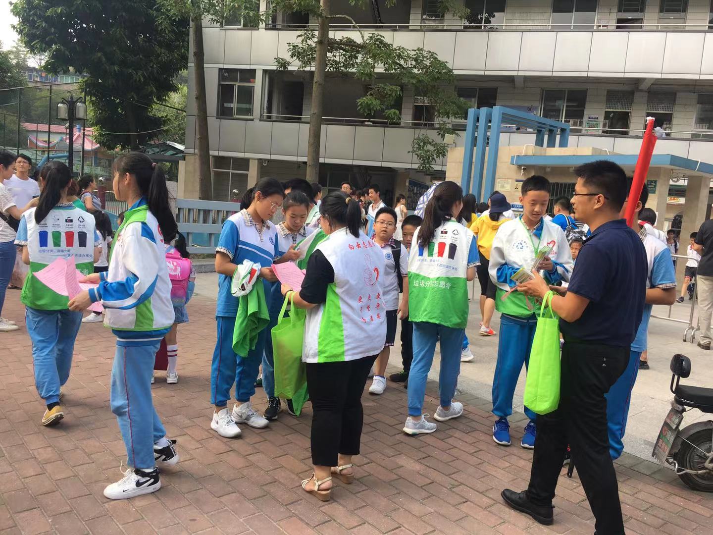 下午15:30,我们又准时穿上“垃圾分类”活动专属的志愿服,在我们学校门口集中,利用下午放学家长接学生的时间,通过派发垃圾分类的小册子、宣传单的方式让老老少少都知道广州已经开始实行垃圾分类政策。同时也呼吁大家不要乱扔垃圾,尽自己最大的努力建设一个干净、美丽的广州,为往后绿色地球提供一份力量。