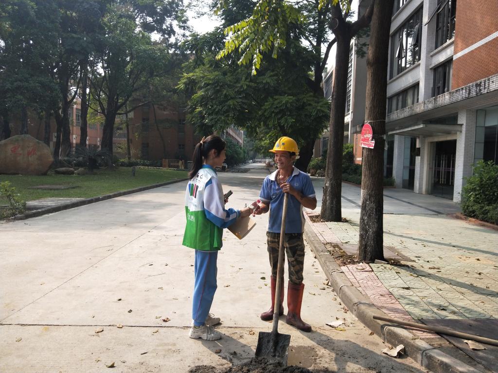 10月12日午后,在鲜艳的团旗引领下,我们分两组出发,寻找城市“美容师”。空山新雨后,天气晚来秋。随着年月的更替,秋天也如期而至,但不变的仍旧是清理整顿街道的环卫工人们。他们一年四季,不惧风雨严寒,都会坚持完成自己的工作,争取为人们提供一个良好的社会环境,这是十分值得敬佩的。懒惰的阳光洒落在大地,但还是有许多环卫工人坚持工作。我们在广外大学校园中寻找城市的“美容师”,但凡遇到一个环卫工人,我们便会分别为他们送上水并拍照留念,我们还一起对他们道:你们辛苦了!叔叔阿姨们也十分谦虚,笑着对我们说:小朋友们真乖!对于他们来说,这大概是世上最幸福的事吧,在炎日下辛勤工作,却不料想会有人在炎热中送来的一股清泉;对于我们来说,这也是世上最幸福的事吧,仅仅一个小小的举动,却温暖了他人又获得了极高的赞美。