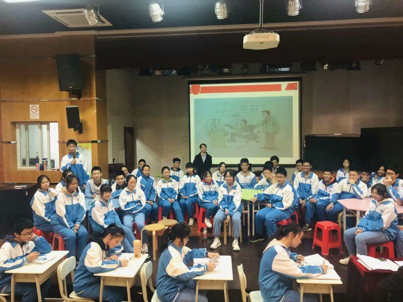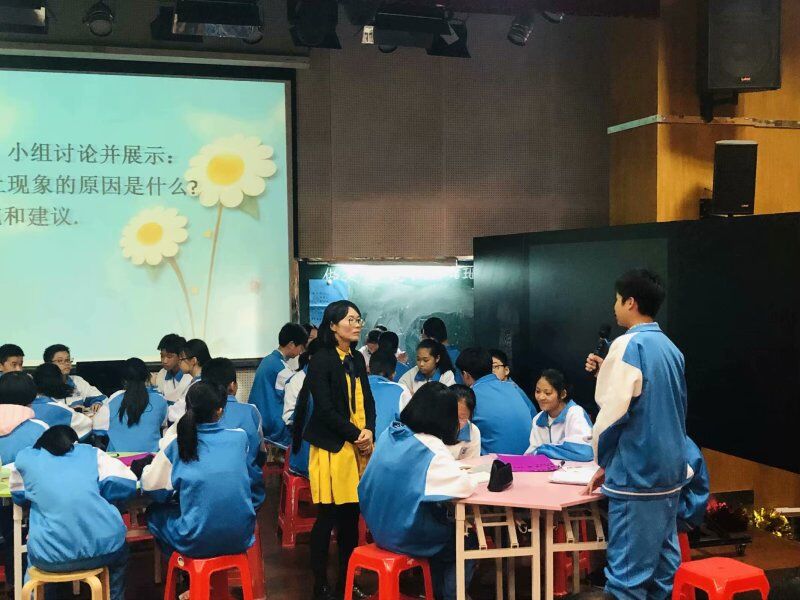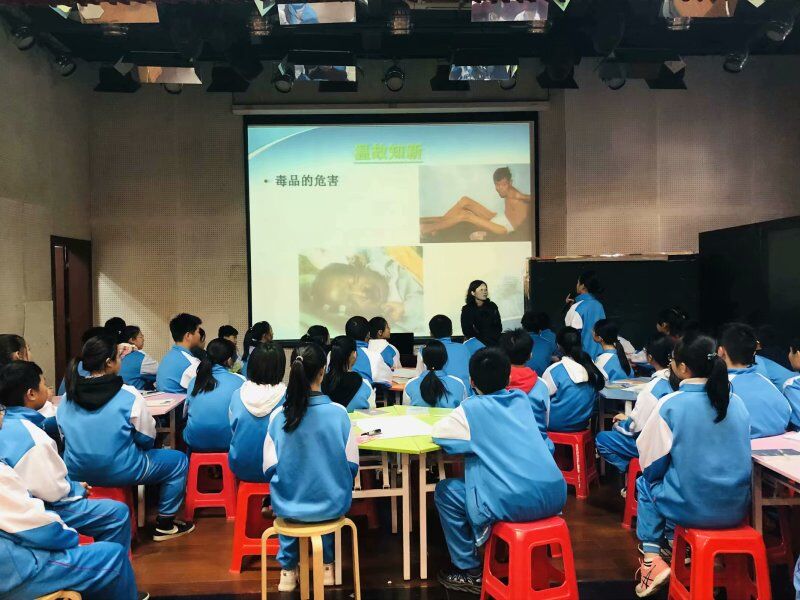 首先参赛的是冯文敏老师,她带着她所执教的初一(1)班,在一段毒品视频中拉开了班会课的序幕。本次班会主题为《珍爱生命,远离毒品》,既而通过学生自导自演的情景剧、小组分析演绎等众人参与的形式,探究分析出青少年容易沾染毒品的原因,以及面对毒品的应对措施,使禁毒观念深入人心。