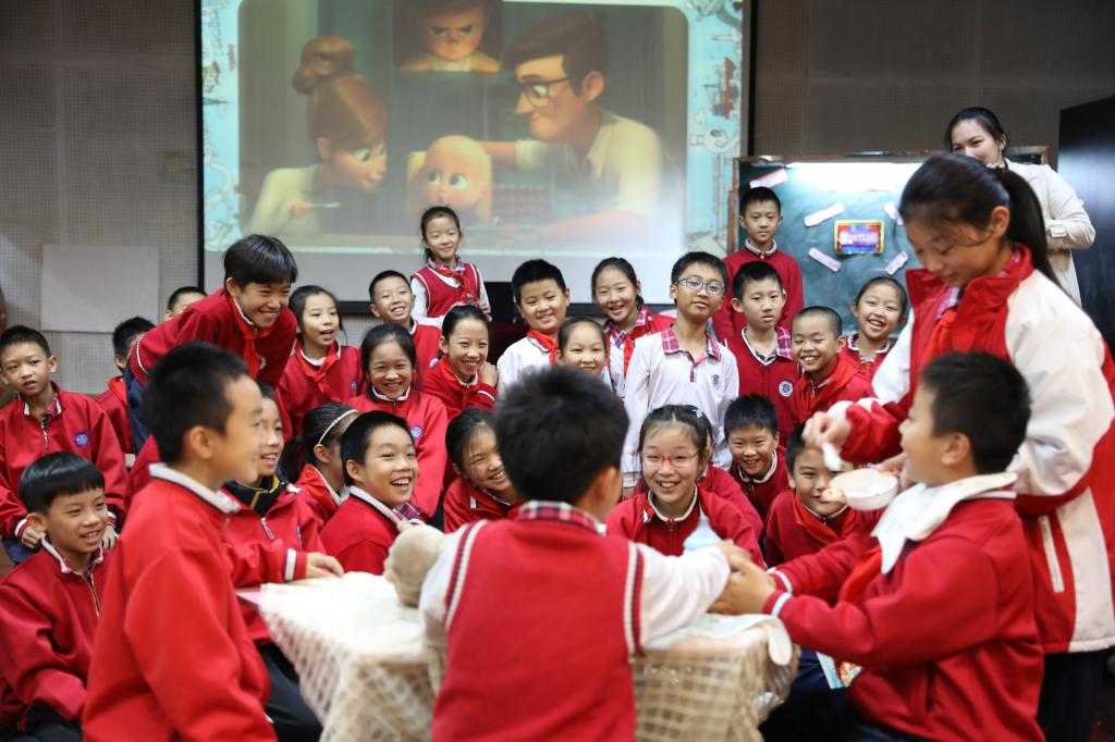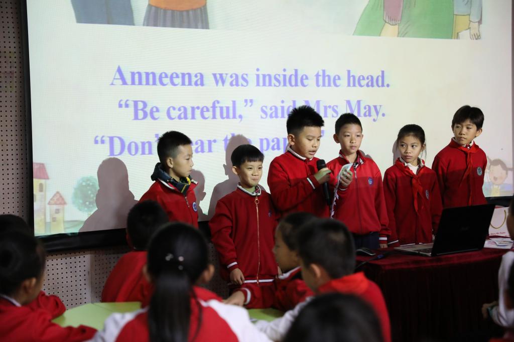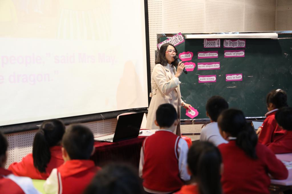 首先是本次教研的第一个环节——研讨课。小学四年级的张春燕和曹涓涓两位老师分别带来绘本课Dragon Dance和戏剧课Puss in Boots。张老师通过make picture book, retell the story等环节,加深学生对故事的理解,随后又上升到know more about the dragon dance等提问,引发学生在文化层面的思考。曹老师则在课程一开始,就通过小游戏Mirror Game调动学生积极性,随后,曹老师带着学生回顾了Puss in Boots的人物以及情绪,并让学生进行模仿和演绎。最后,让学生通过小组合作的方式,对电影片段Baby Boss进行模仿、演绎,并从intonation, emotion, body movement, teamwork几个维度对学生进行评价,将课堂又推向了一个新的高潮。