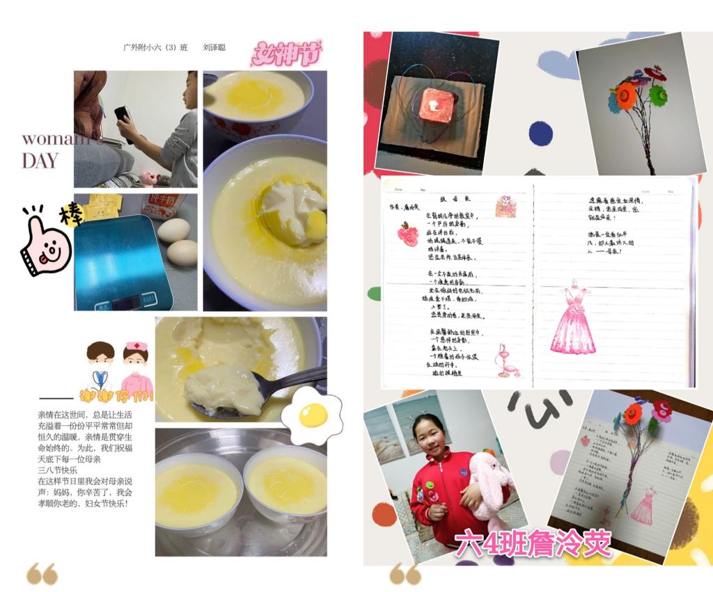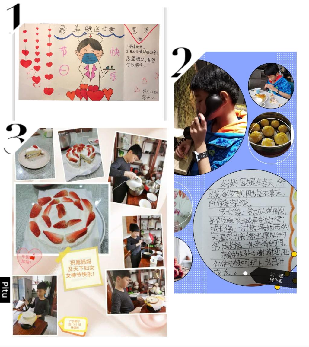 三年级同学亲手制作了爱心贺卡,用七彩的画笔、真诚的话语表达自己对妈妈、奶奶和外婆的爱,以及对抗疫女性医务人员的敬佩。