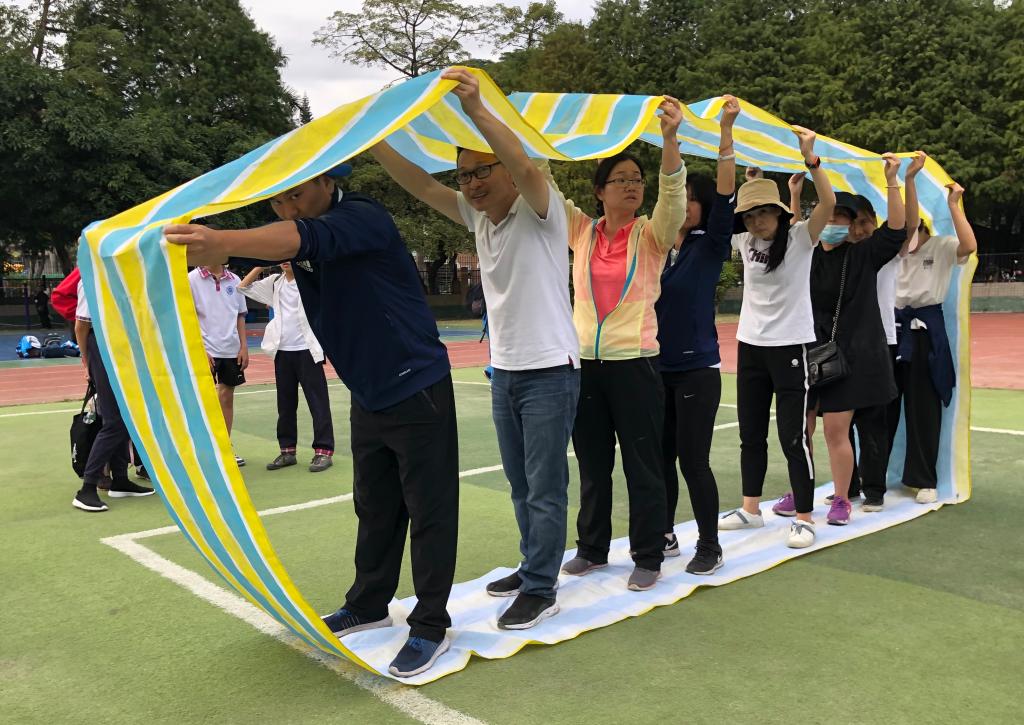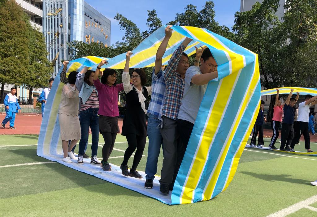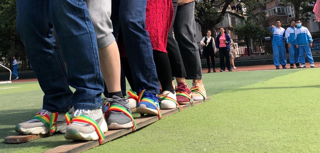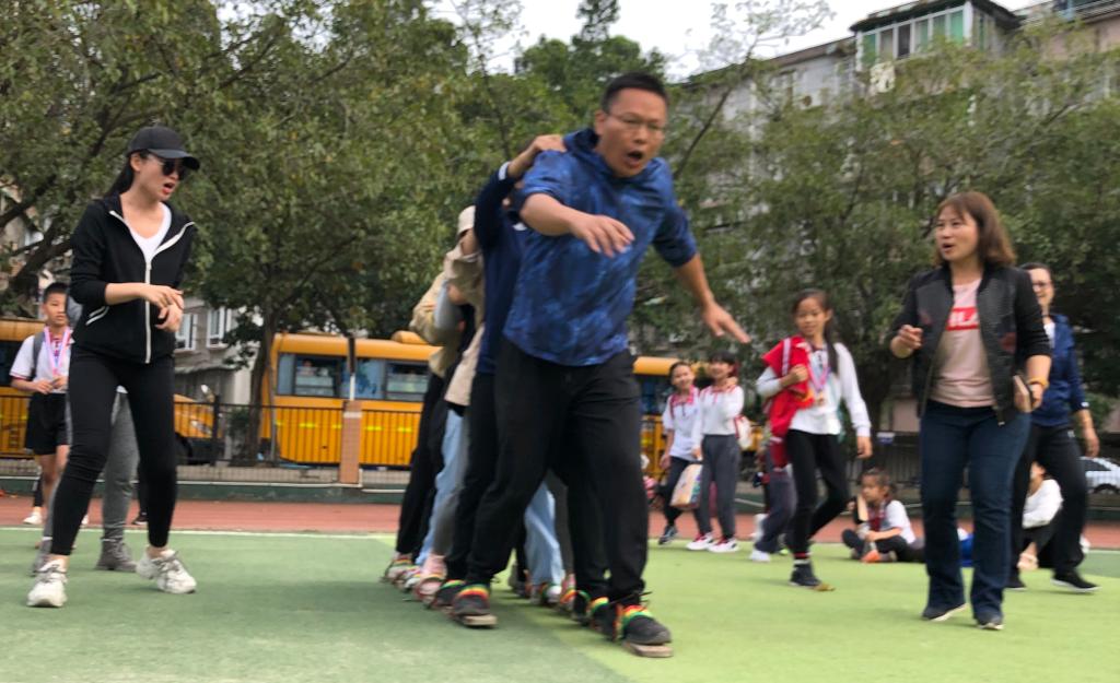 “同舟共济”是团队协作型户外游戏,老师们穿上特制鞋板走向终点,用时最短的队伍获胜,主要考验同事之间的配合力、默契度和团队意识。