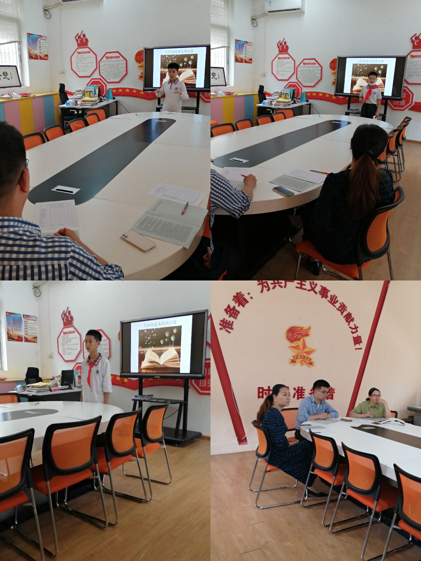 比赛当天一边是选手们在图书馆安静的备考,他们认真又紧张,口中念念有词,心中不断思索。另一边队部室三名评委正仔细的倾听现场选手的复述,并认真做记录。现场气氛严肃,紧张,选手们抓住时机极力表现自己的优势,有的利用最强大脑,记住故事的任何一个细节,侃侃而谈。有的声情并茂,边讲边演。有的展示自己的语言能力,结合名言警句,娓娓叙说。也有的没把握住时间叙说半途被叫停了。也有的紧张怯场了。