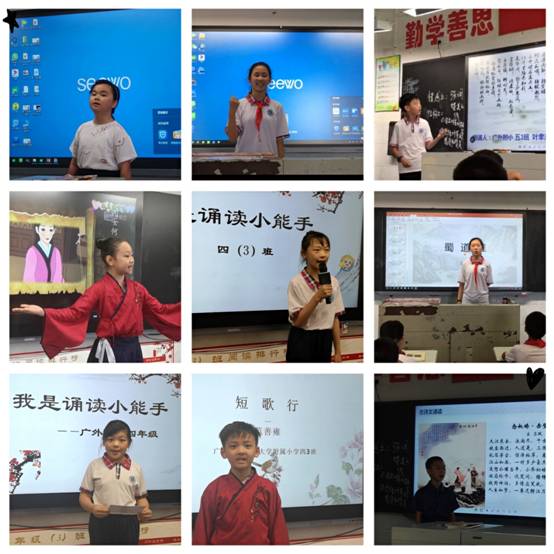 在这个初夏醉人的五月,白云区古诗文诵读展演活动开始了,我们积极的参与了“古诗文诵读小能手选拔”活动,1—6年级各班级纷纷行动起来,用诗的语言,传递着孩子们心灵的感悟;用诗的声音,演绎着孩子们的梦想和力量。经过选拔,六名小选手脱颖而出。这次活动因疫情影响,采用线上线下相结合的方式举行,根据要求,5月18日下午在礼堂集中录制了诵读小视频,优美的意境,优雅的表演,优质的诵读给我们献上了一个个精彩的节目。
