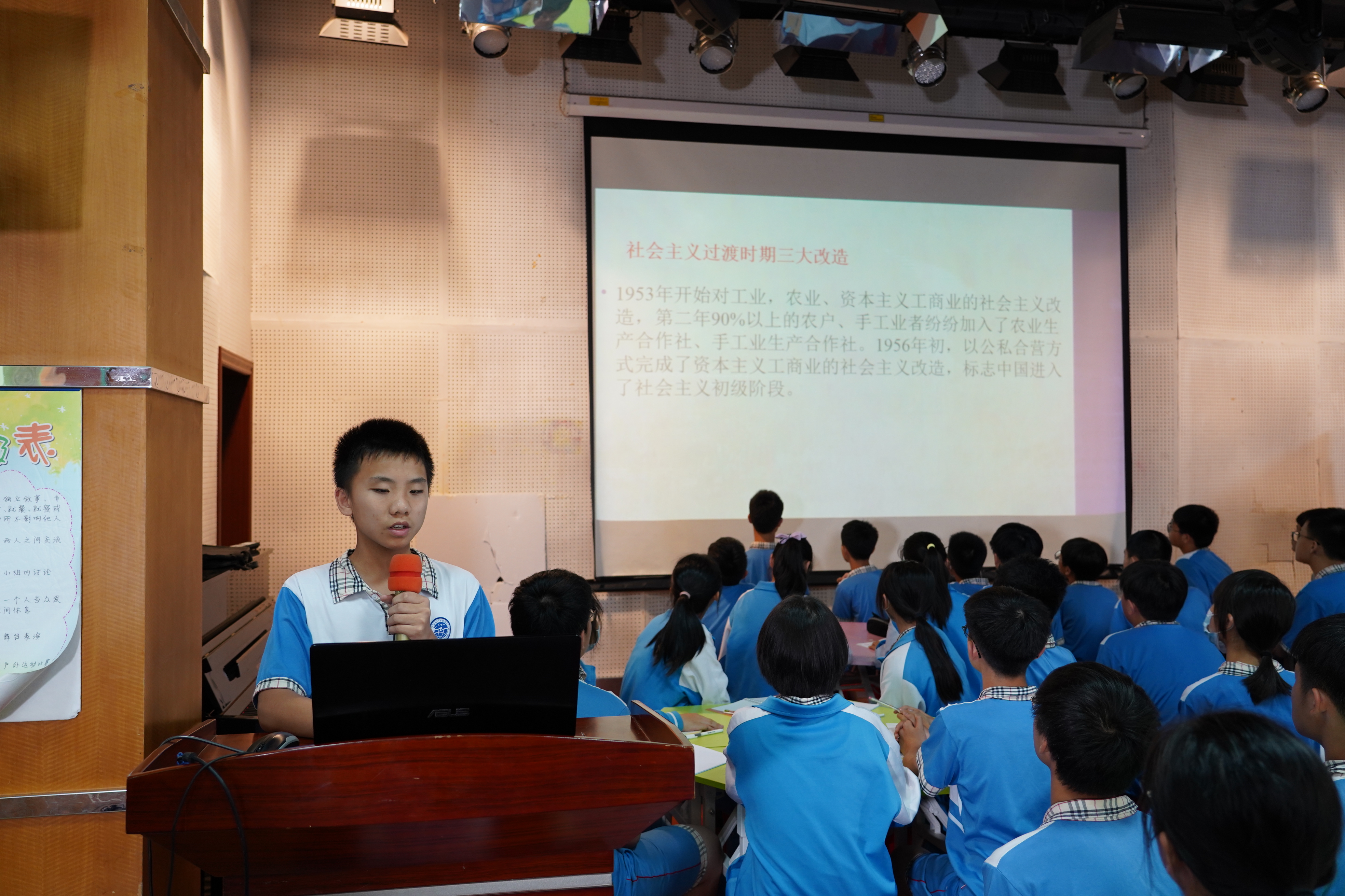 初二(3)班陈鑫老师则把社会主义发展史向同学们娓娓道来。他采用分类归纳的方式,把社会主义发展史分为:社会主义改造阶段、曲折发展阶段、改革开放阶段、飞速发展阶段。还介绍了重要时间节点里的历史性会议,使同学们对我国的社会主义发展历程有了全面的印象。同时通过小组汇报的方式,让同学们分组轮流上台向大家展示了各阶段我国工业、农业、科学技术等领域的发展成就,强调知识的内化。