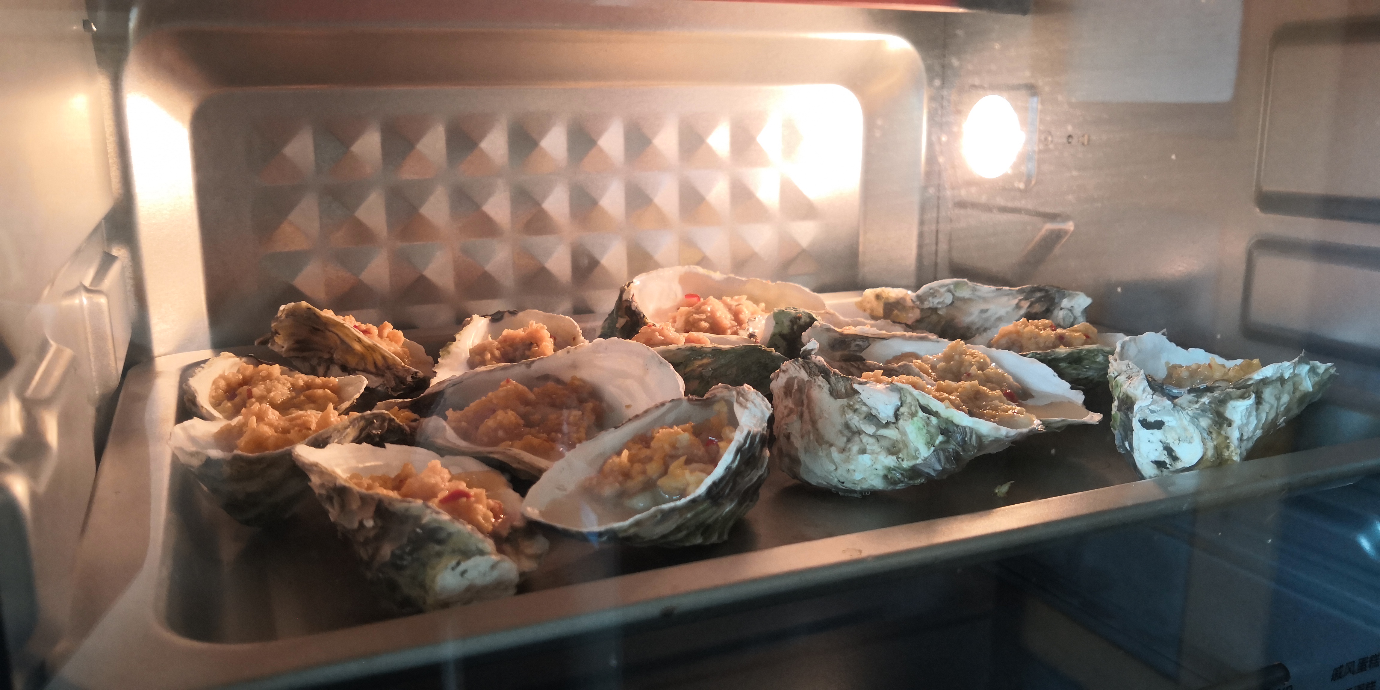 我做的是烤生蚝。烤生蚝首先要将生蚝洗干净;然后剁碎蒜蓉和姜末,并与酱油调和在一起;接着放入生蚝内,放入烤箱。20分钟后,香喷喷的生蚝就上桌啦!