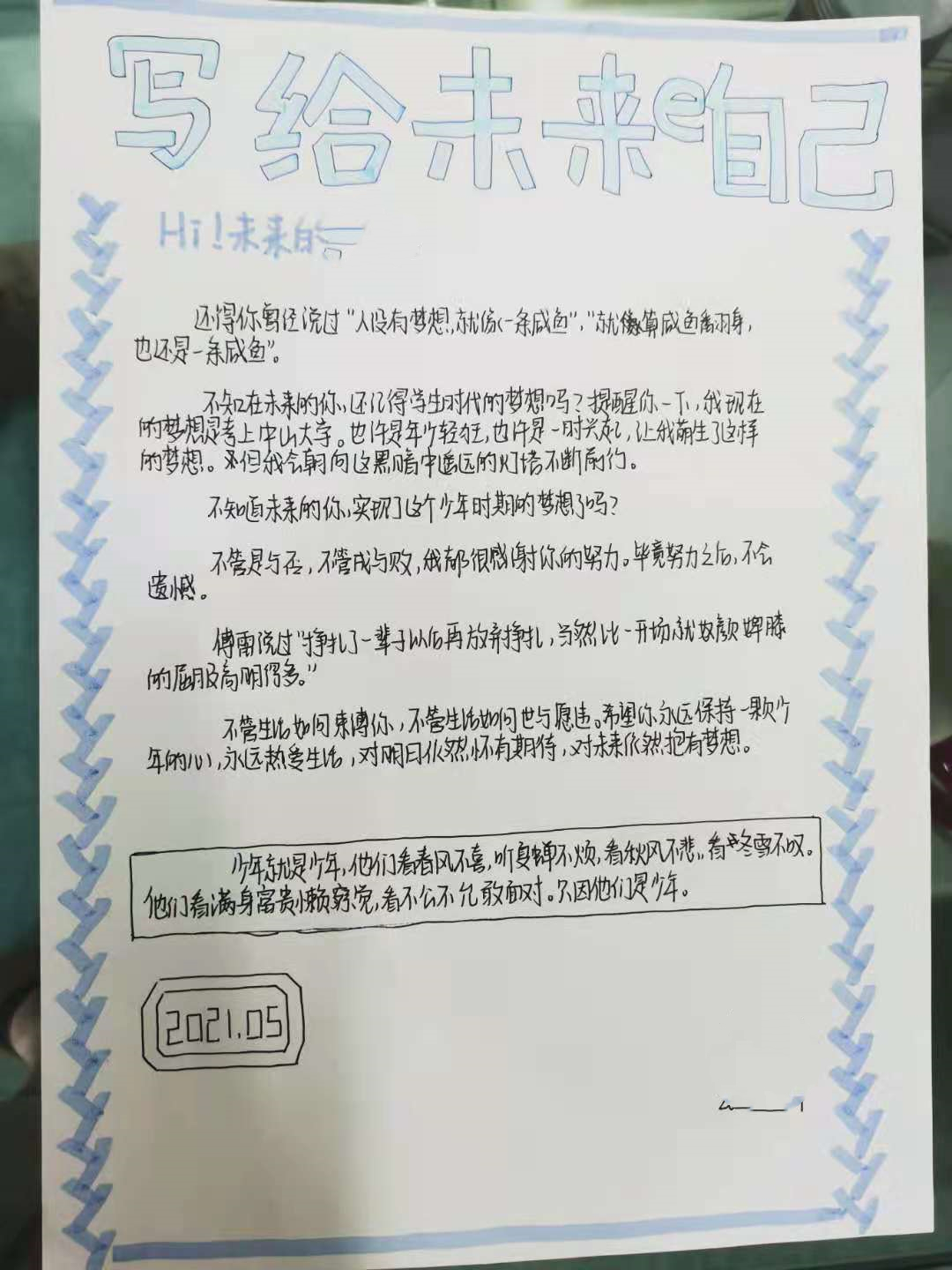 书信作品让同学们坐上时光穿梭机,写给未来的自己。他们把对未来的期待、对梦想的追求、亦或是对明天的向往写在了一封封对自己的温暖话语里,边诉说、边成长为那个有爱、有梦的自己。