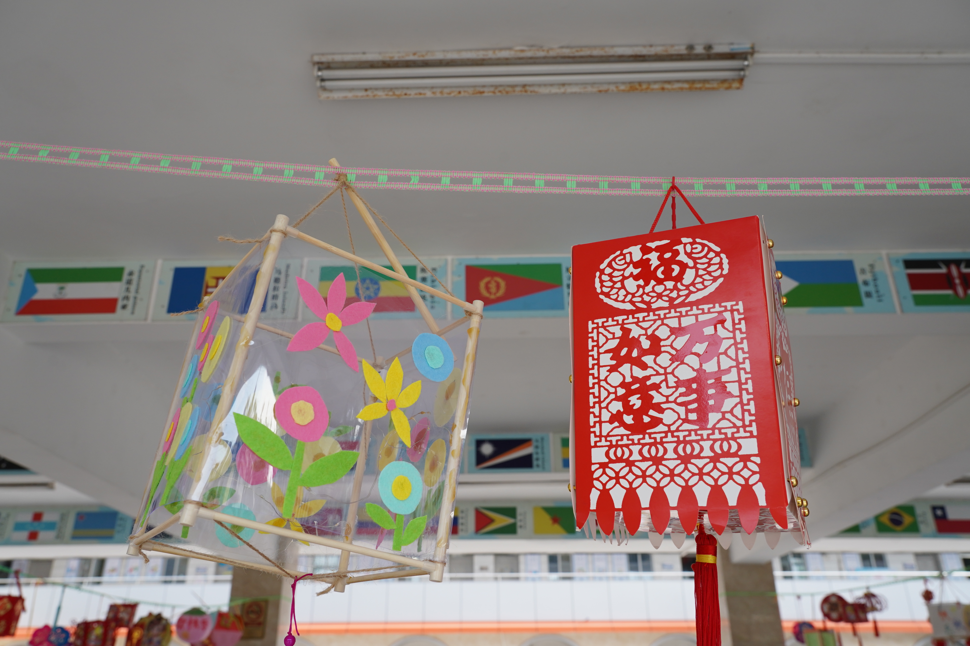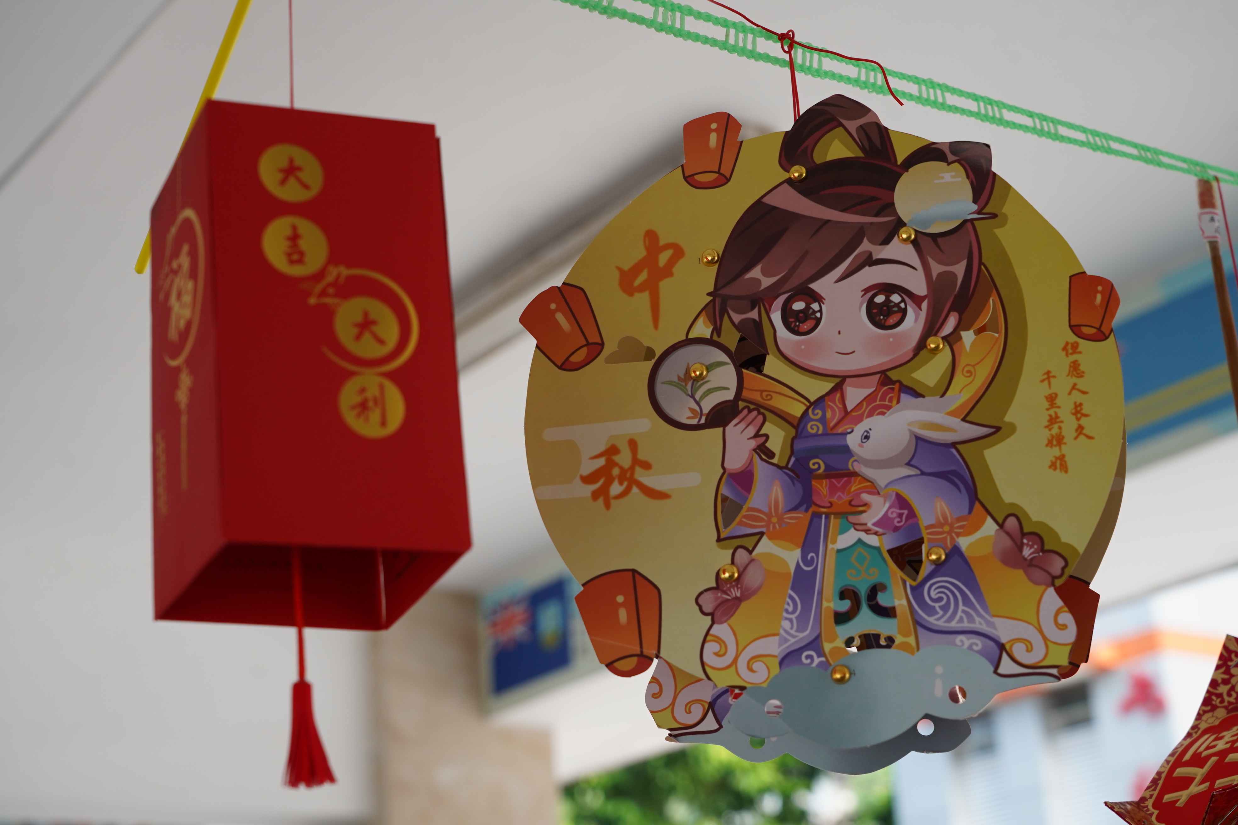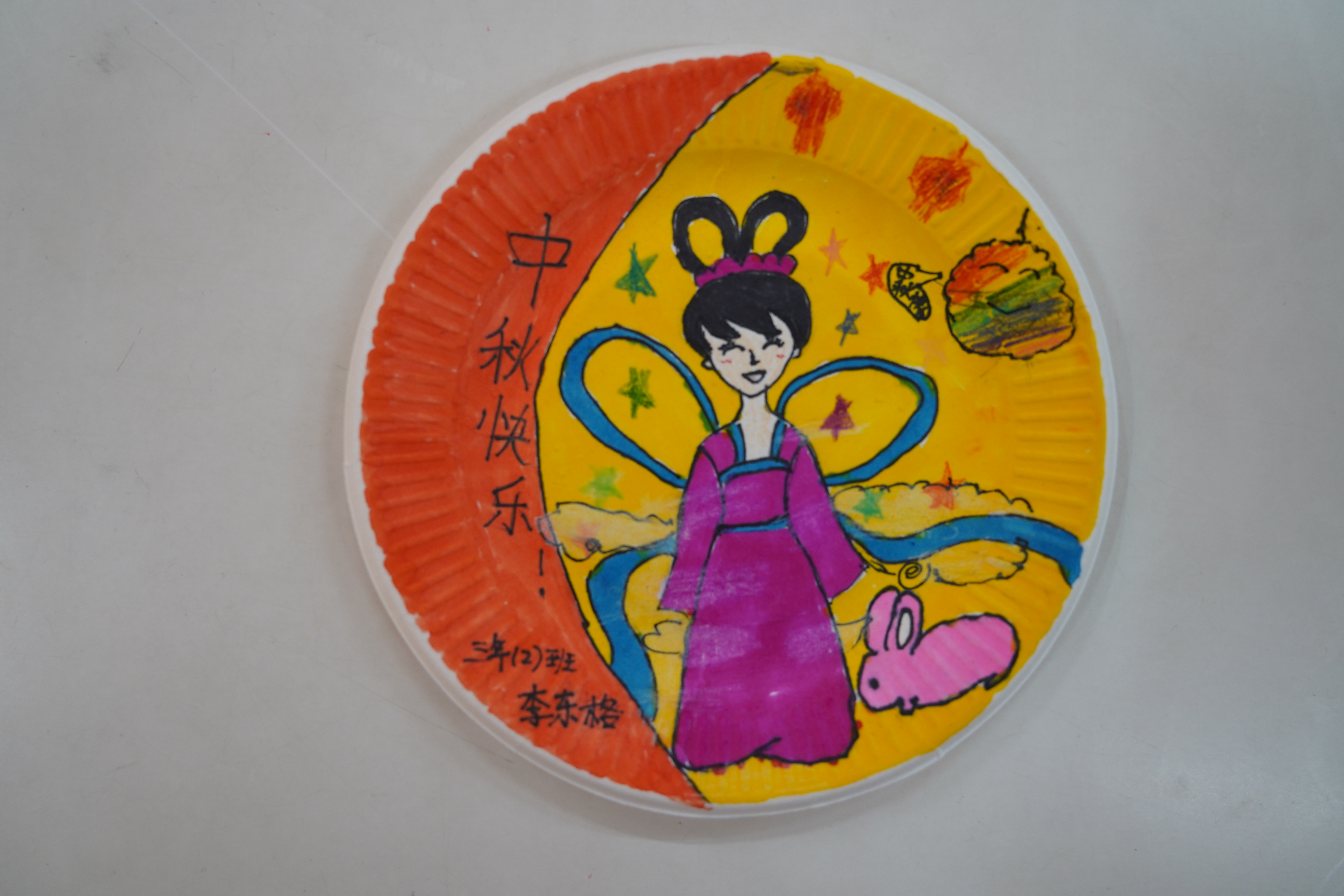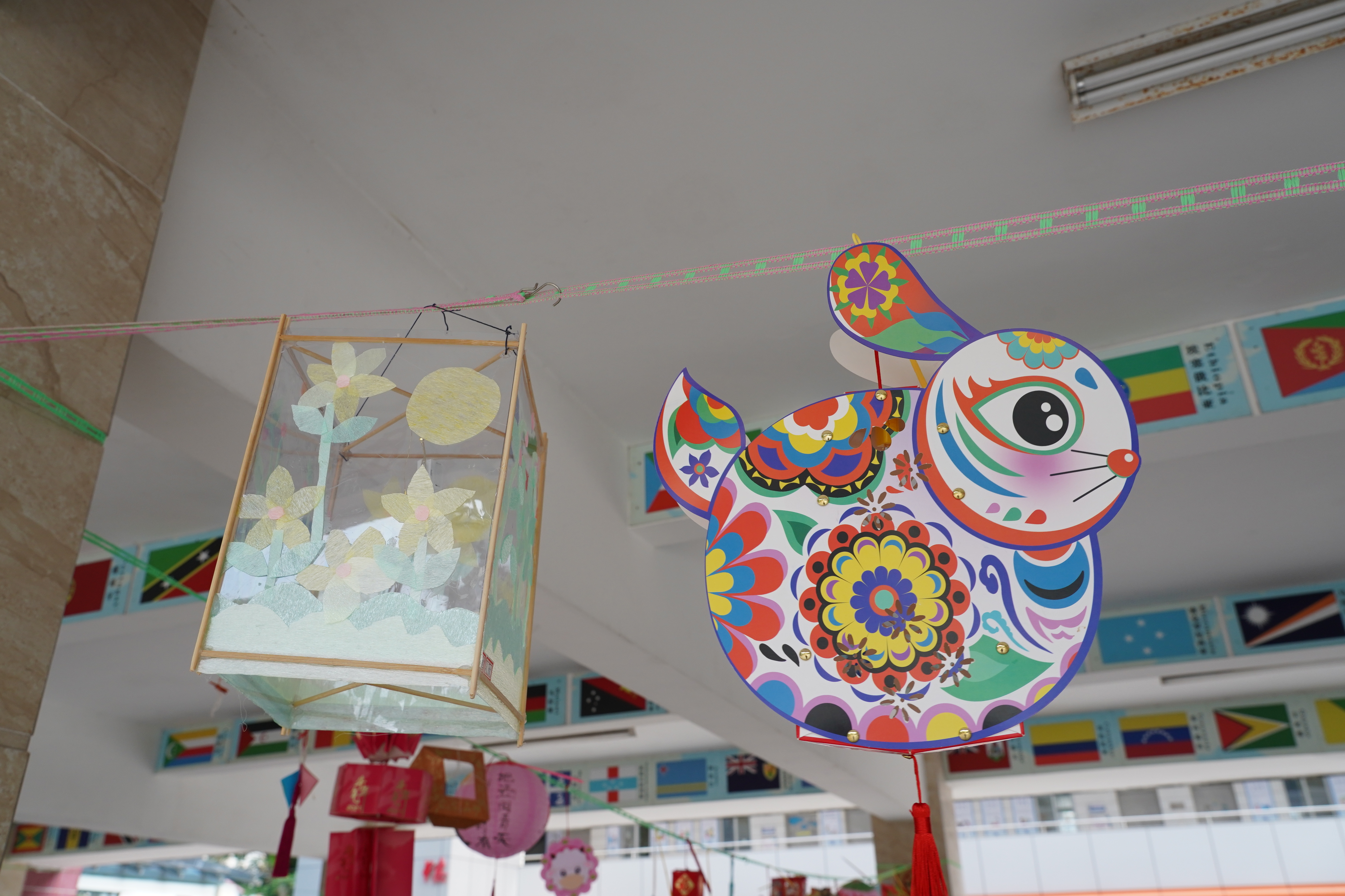 此外,一至三年级的同学们还画了纸盘画,他们用丰富的想象力、缤纷的色彩把他们对中秋佳节的理解描绘在纸盘上。四至六年级的同学们则制作手工灯笼,灯笼形态各异,制作精美,为校园增添了另一番风景。