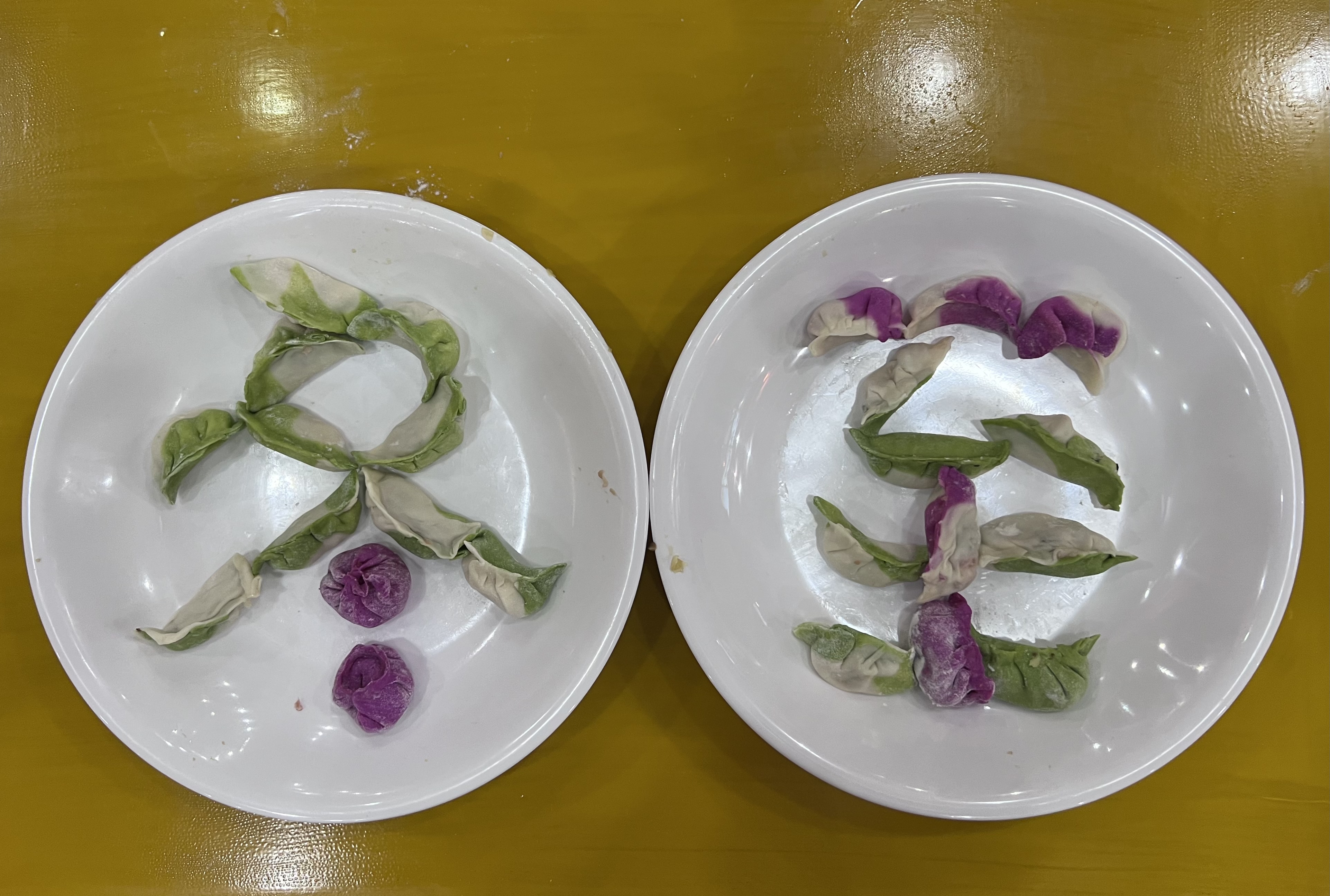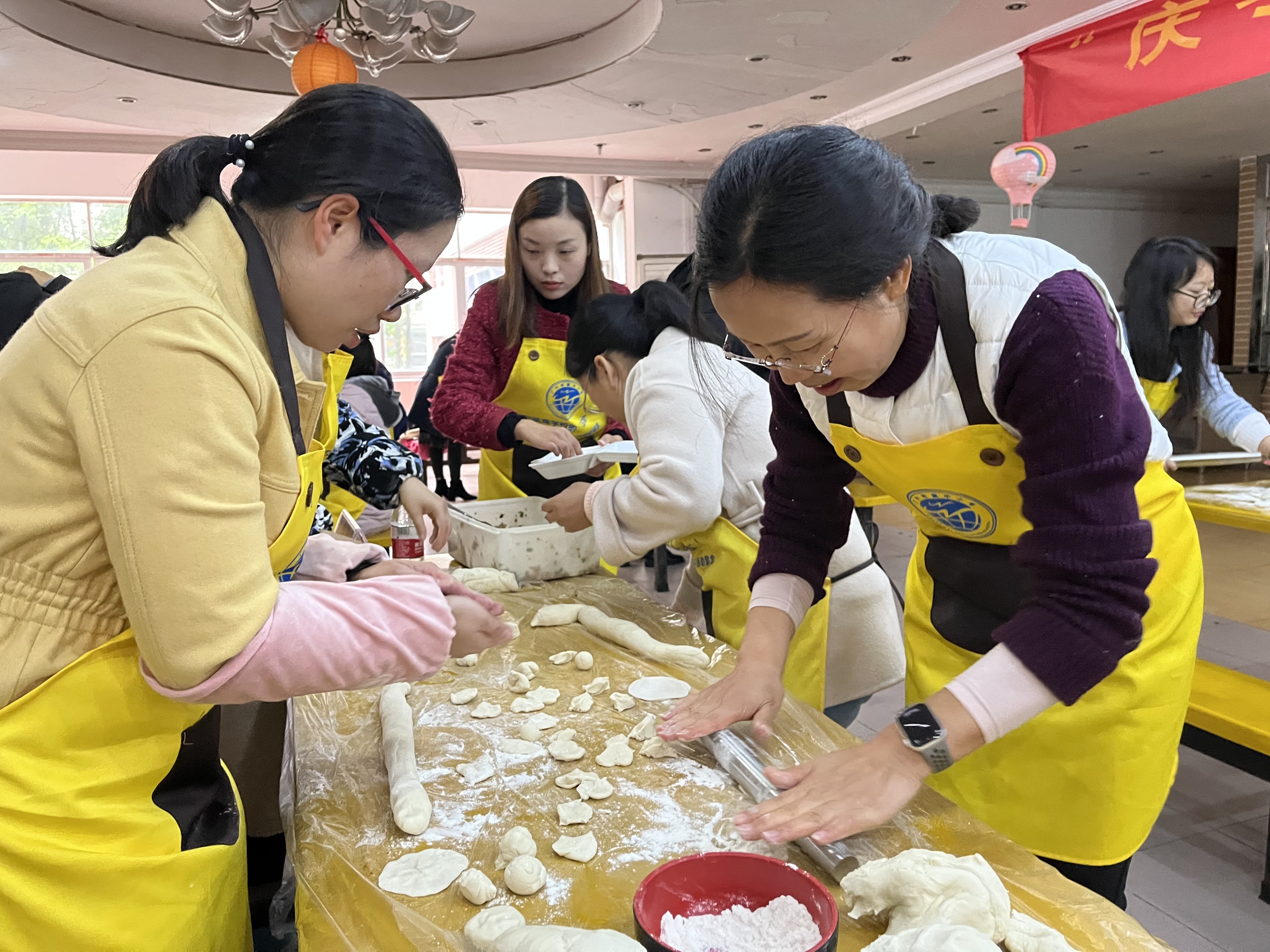 10:15,比赛正式开始。只见各组人员分工明确,调馅、揉面、擀皮儿、包饺子、摆盘等工序有条不紊。活动现场气氛热烈,附校的老师们不仅上得了课堂,而且下得了厨房,大家纷纷亮出绝活。看,她们动作娴熟,馅一放,手一捏,一个寓意吉祥如意、财源滚滚的元宝饺子就完成了;有的包了弯弯的月牙饺子,寓意着花好月圆......不一会儿,就像变戏法似的,一个个形态各异的饺子如“士兵”般排排站立,颇有“一声令下,勇往直前”之势。