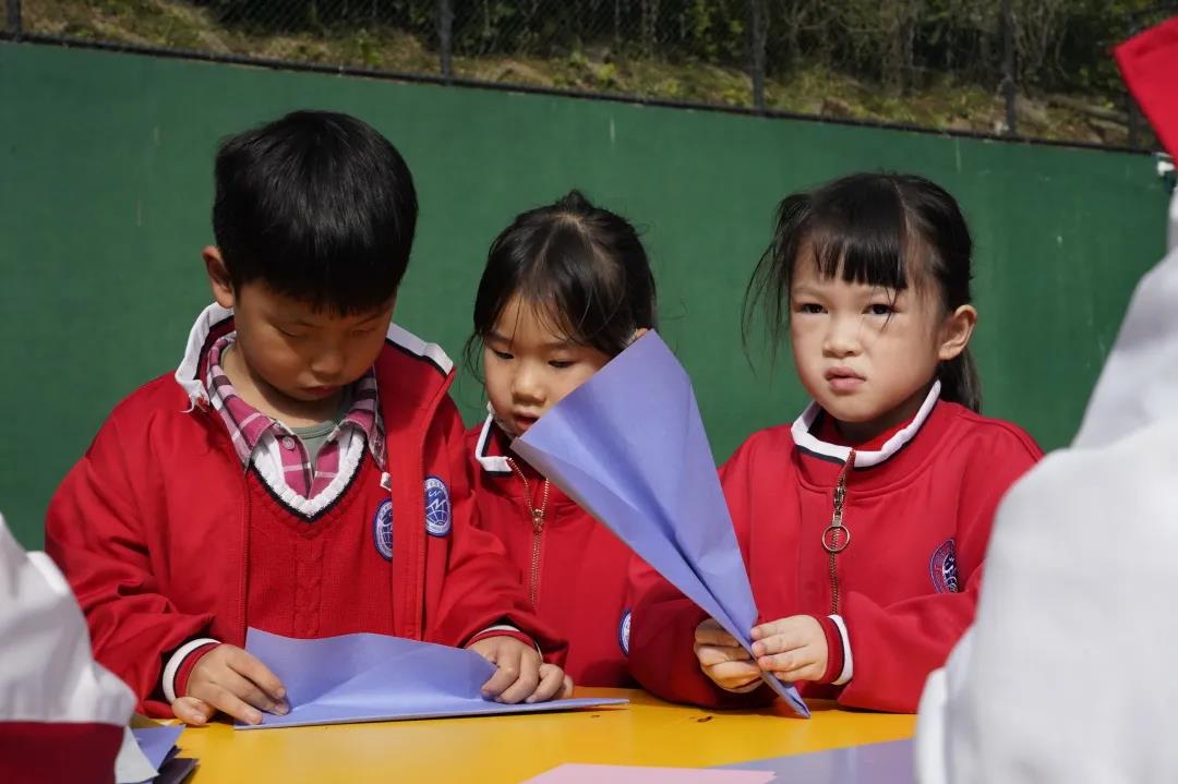 “我的小创意”,让孩子用正方形或长方形彩纸进行自由创作。孩子们把本学期在美术、创客、科学课堂上学到的本领都一一展示出来。有的折飞机,有的折扇子,还有的折千纸鹤、青蛙等等。