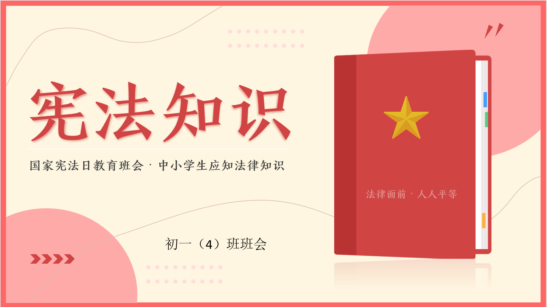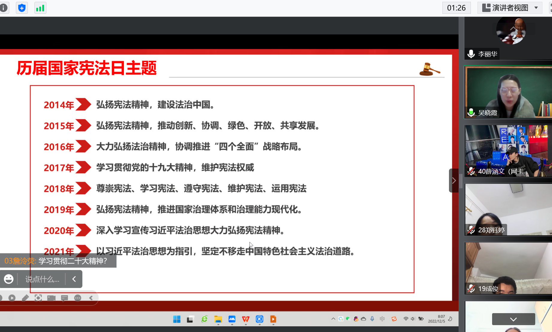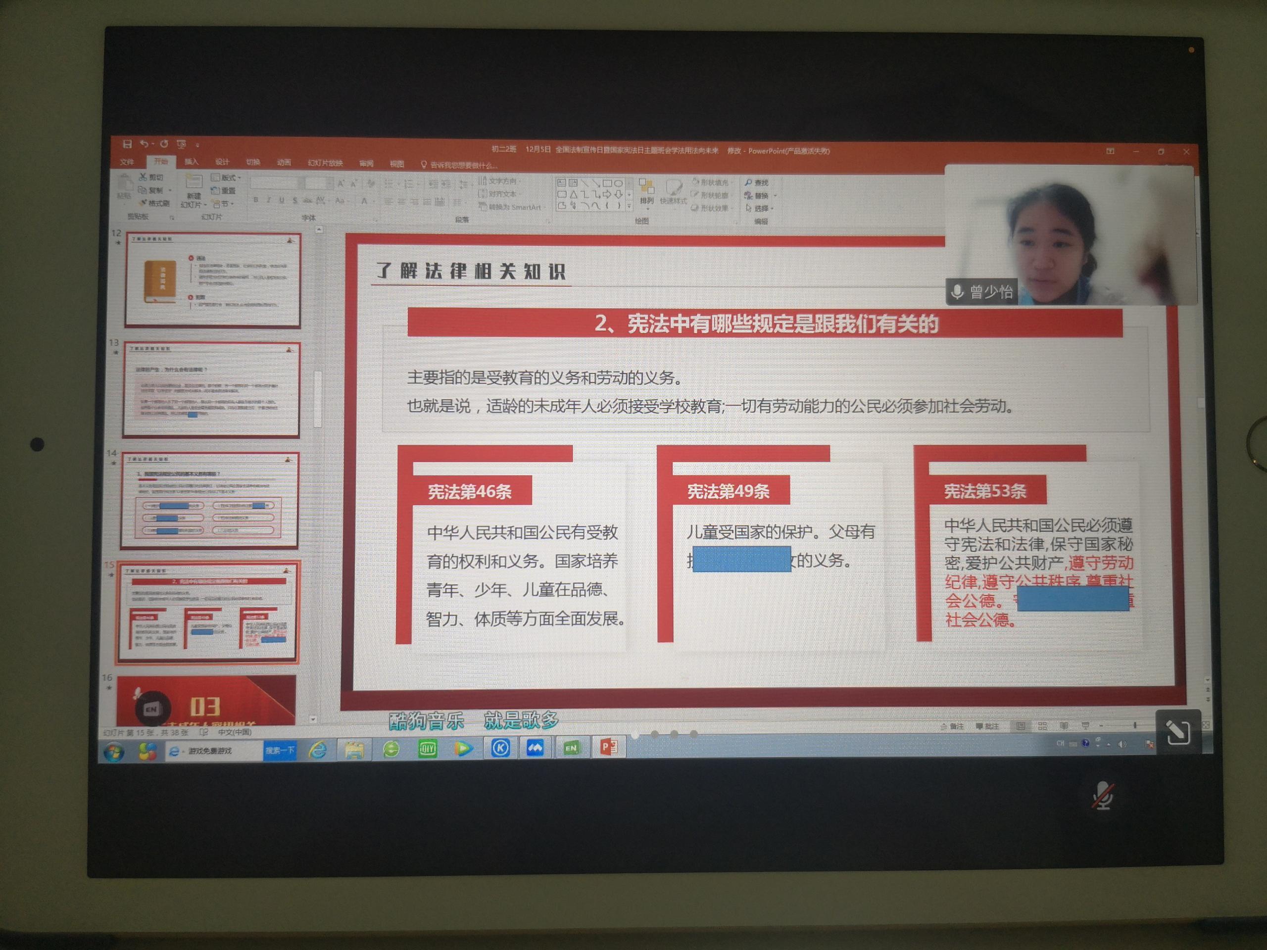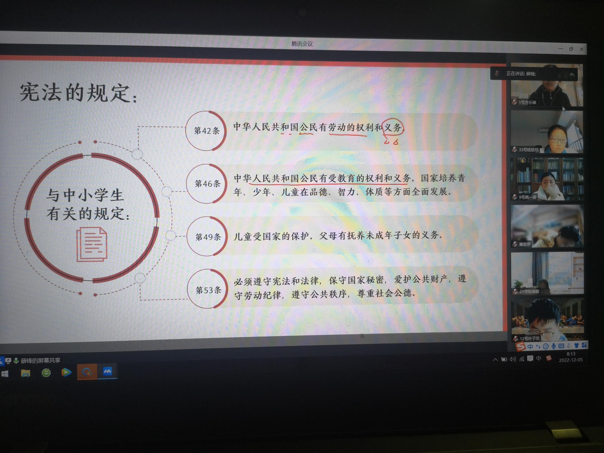 12月4日,是我国第九个“国家宪法日”,为了大力弘扬法制精神,进一步增强学生的法律意识和法治观念,深入开展普法教育,营造和谐校园氛围。我校于12月5日上午开展了学习宪法活动,各班线上召开“学宪法 讲宪法”主题班会。