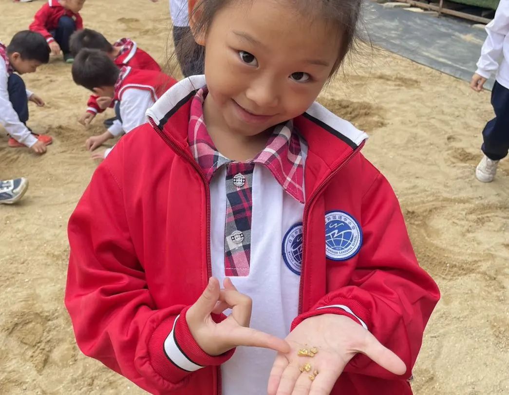 “沙中淘金”也是孩子们最感兴趣的活动,他们人手一个小筛子,眼睛紧紧盯着那一堆沙子,仿佛里面藏着无尽的宝藏,迫不及待地开始了淘金沙游戏。小手有节奏地晃动筛子,沙子细细地从筛孔漏下,就像时间的流沙。突然,一抹金色在阳光下闪耀,那小小的金粒如同夜空中最亮的星,瞬间点燃了孩子们的热情,欢呼声此起彼伏,沙池边满是快乐。