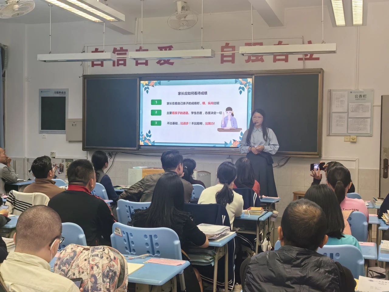 年段会议结束后,家长们移步到各班级教室。班级家长会上,学生落落大方的主持,班主任们就开学以来班级各项工作的开展情况、班级管理、学生近期的表现向家长们进行介绍与分享,分析了孩子们存在的问题,明确了今后学校教育和家庭教育的重点。学科教师分别从期中训练情况、中考形势、学习经验进行了分析。让家长明确初中阶段各学科学习的要求和目标,同时了解到孩子当前知识的薄弱点,并且给出了具体的、有针对性的措施和建议。帮助孩子们顺利地适应从小学到初中的巨大变化。