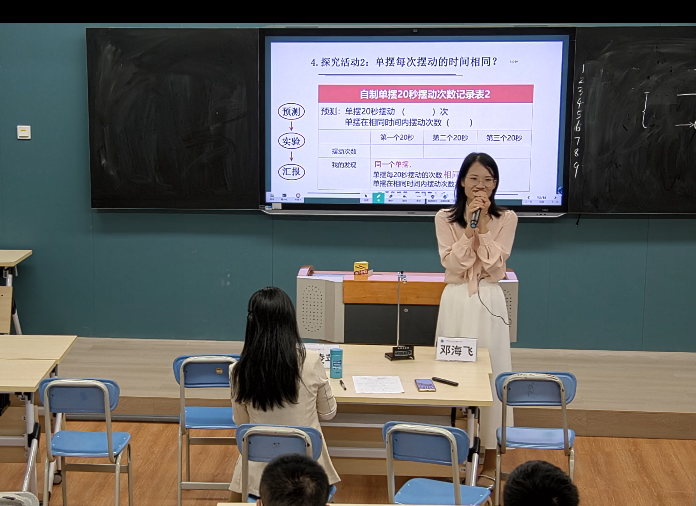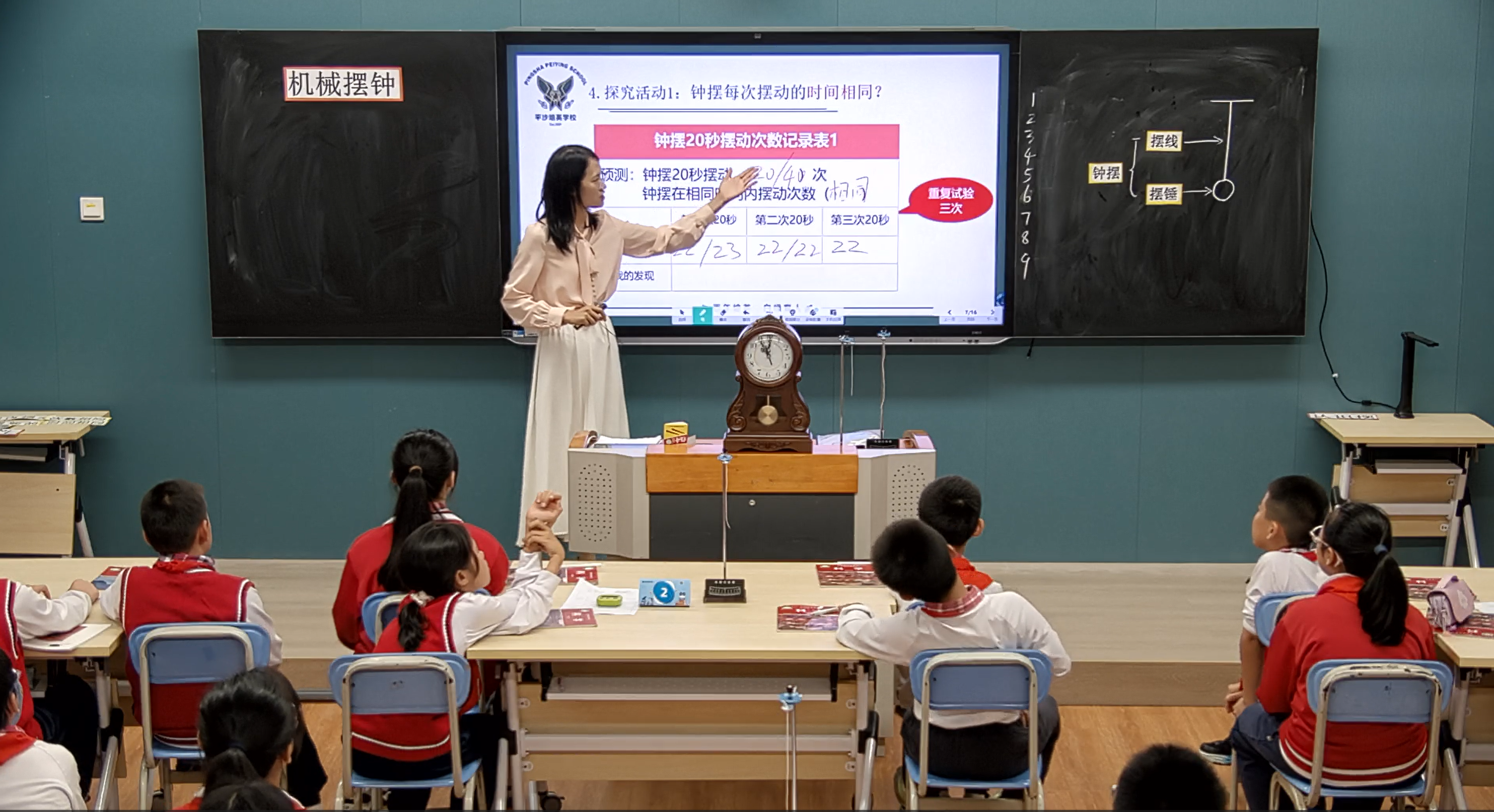 随后,广州市白云区平沙培英学校的邓海飞老师展示了《机械摆钟》一课。邓老师通过视频导入,介绍了伽利略关于摆的研究,激发了学生们的好奇心。接着,邓老师引导学生们动手制作一个单摆,并观察和测量单摆在相同时间内摆动的次数,从而理解摆的等时性原理。学生们在小组合作中积极探究,不仅学会了制作单摆的方法,还深刻体会到了科学探究的乐趣。