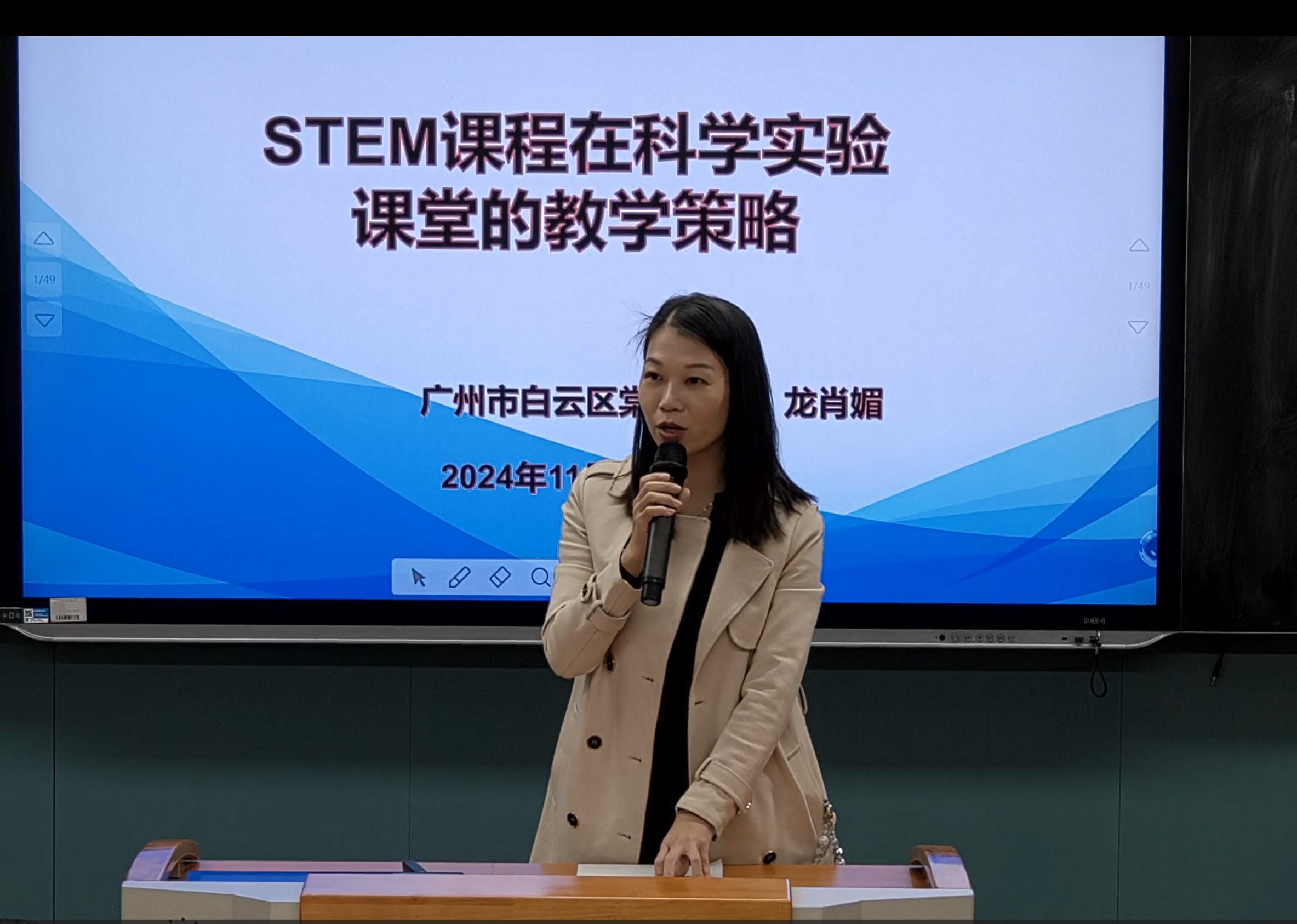 活动由白云区白云外国语小学教师发展中心的吴玉梅老师主持开场,随后进入了精彩的专题发言环节。广州市白云区棠涌小学的龙肖媚老师分享了《STEM课程在科学实验课堂的教学策略》,她结合具体案例,深入浅出地讲解了STEM课程理念在小学科学实验教学中的运用,为教师们提供了新的教学思路。
