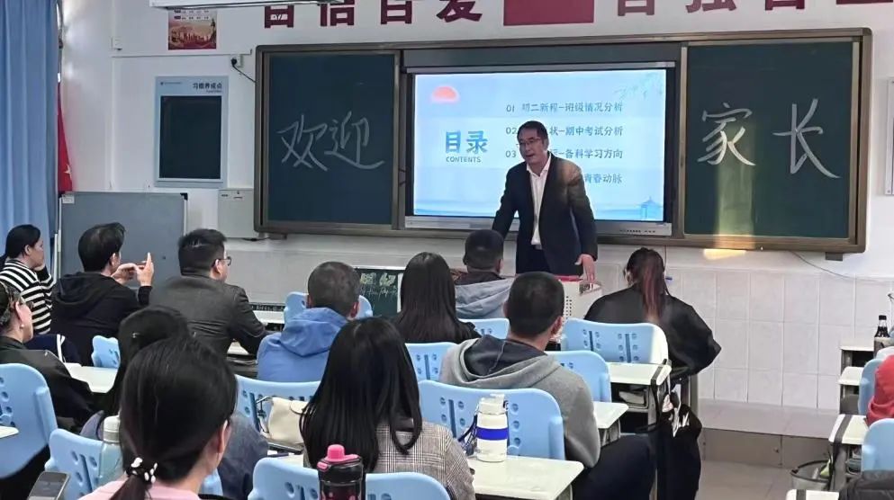 班主任向家长们详细汇报了开学以来班级在教学、德育、课外活动等方面取得的显著成就。通过生动的数据和鲜活的案例,展示了孩子们在学业成绩、综合素质、创新能力等方面的显著提升,彰显我校活动育人的特色理念。同时,班主任重点与家长们沟通了青春期表现中的“初二现象”,分析了孩子们的综合现状,分享了应对的智慧,并以目标卡引领学生,表达了对学生未来发展的信心。期待初二新程,家校合力,筑梦前行!