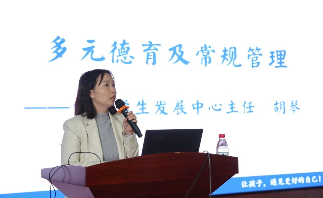 中学学生发展中心主任胡琴则重点介绍了附中的多元德育及常规管理,七彩德育、知心育人,通过具体案例展示了学校在学生全面发展方面的努力和成果。