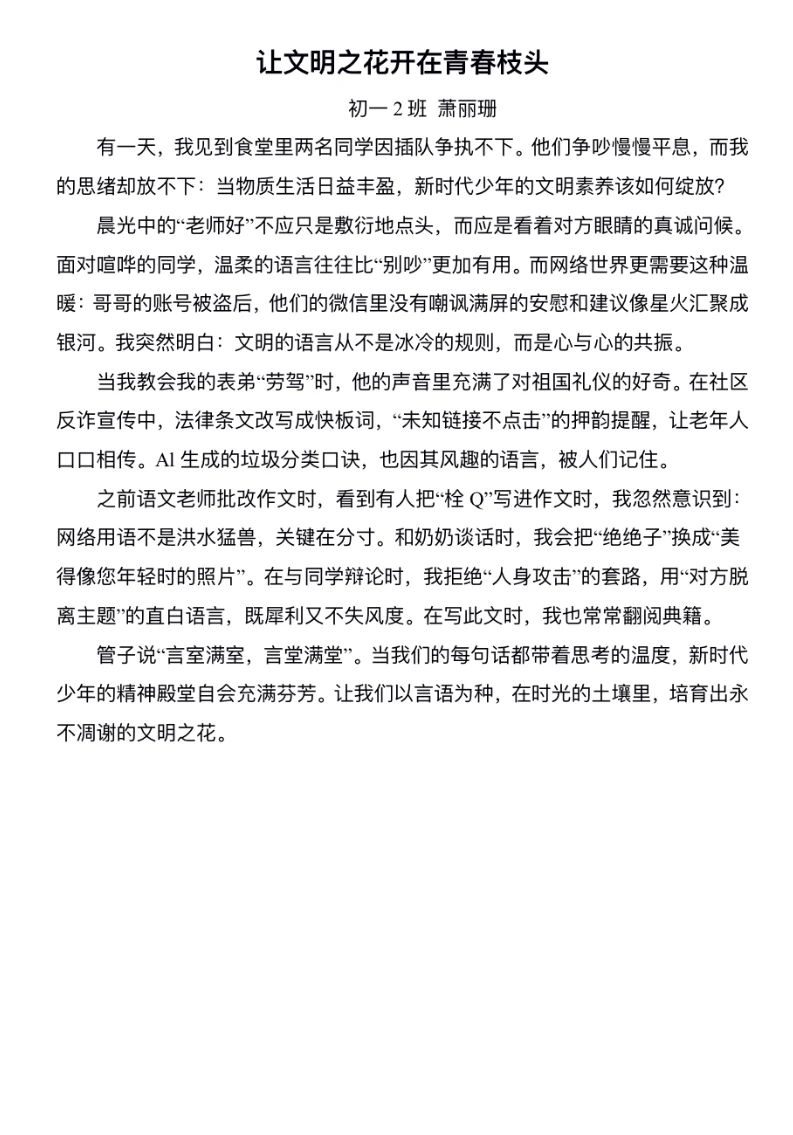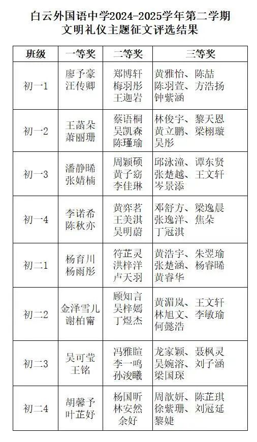 为深入推进校园精神文明建设,培养学生知礼明仪的良好品格,白云外国语中学于近阶段成功举办"言行成雅,争做新时代文明好少年"主题征文比赛。经过语文科组教师的专业评审,获奖名单正式揭晓,多篇优秀作品脱颖而出,展现了我校学子对文明礼仪的深刻思考与真挚感悟。
