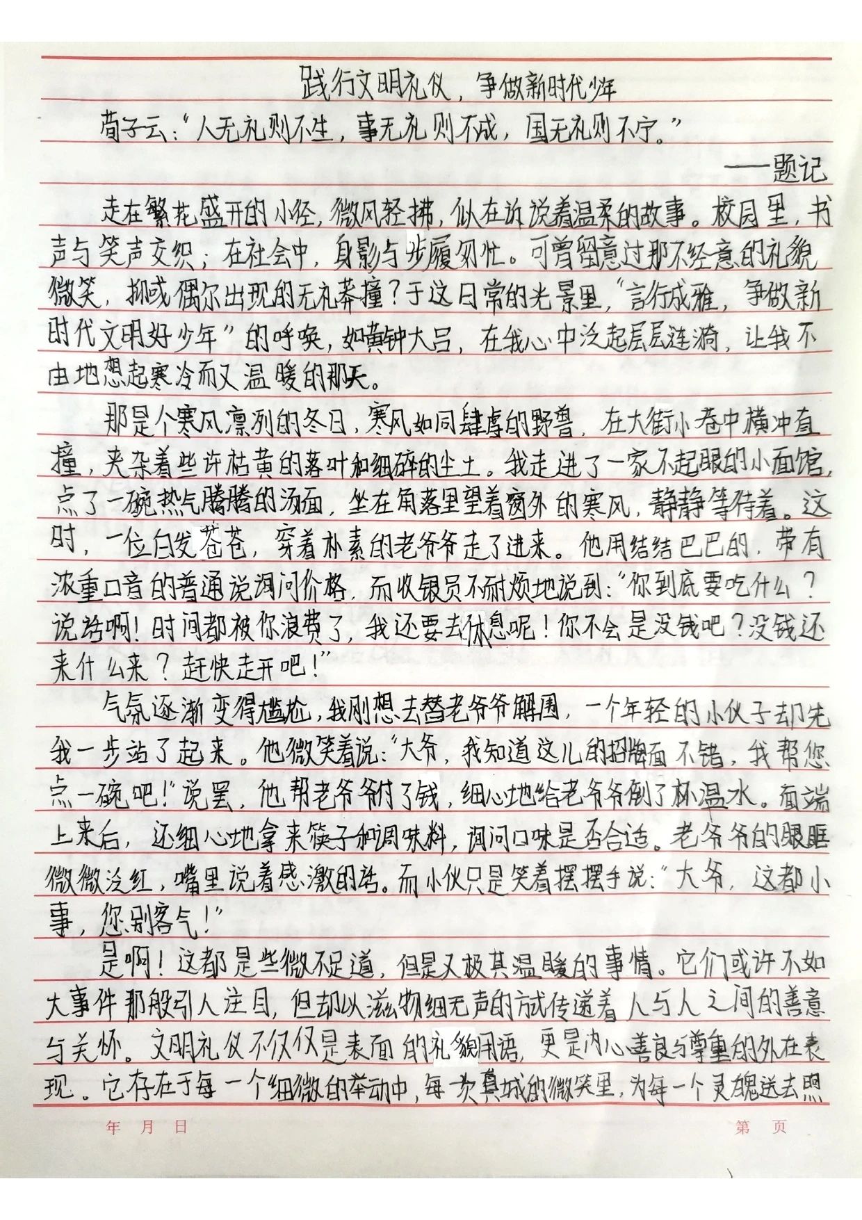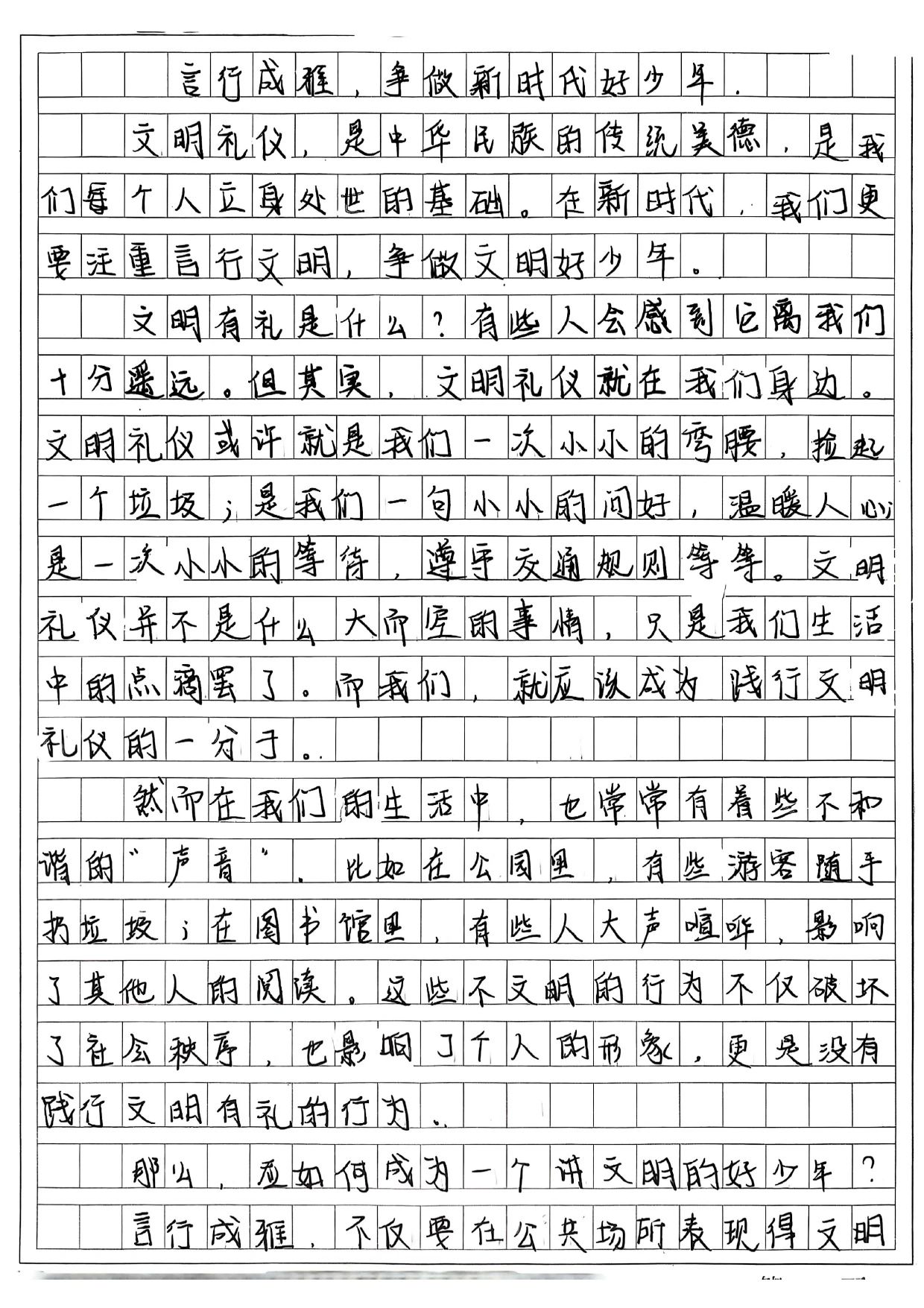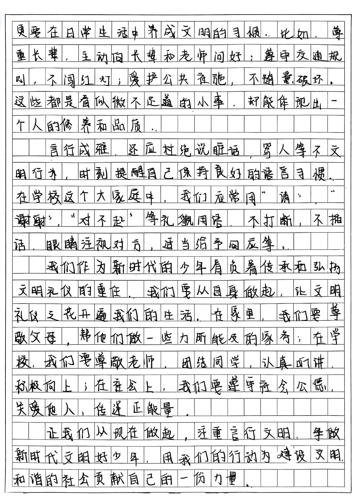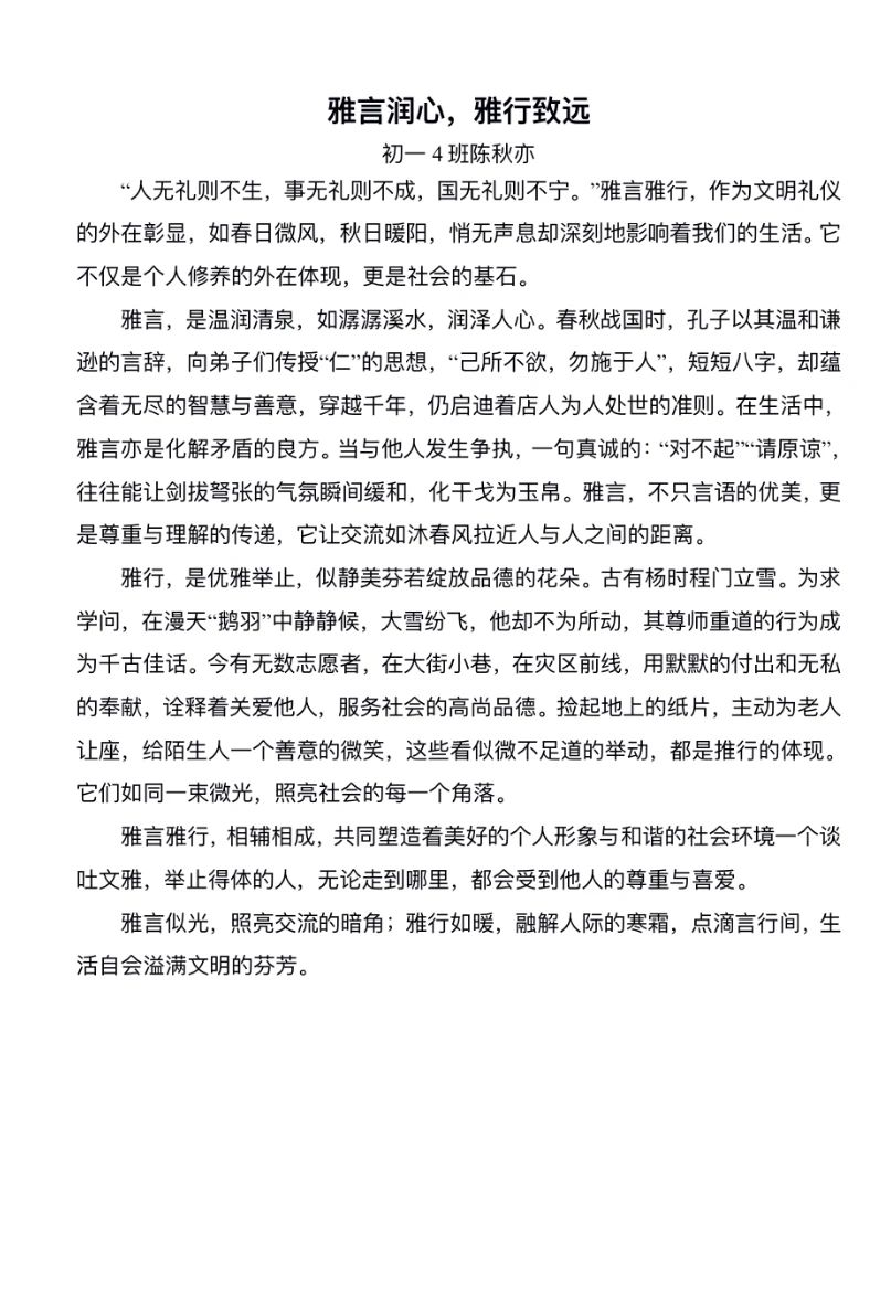 在获奖作品中,既有以校园生活视角记录文明细节的《捡起一片纸,种下一颗星》,也有引经据典探讨礼仪传承的《雅言润心,雅行致远》;七年级学生以《让文明之花开在青春枝头》讲述校园礼仪教育,八年级学生则用《携手共进,言行成雅》呼吁于细节入手,从小事做起践行文明修养。这些作品将抽象的道德准则转化为鲜活的生活场景,体现了同学们对文明礼仪的独特诠释,更彰显了作为新时代少年传承美德、共建和谐社会的责任感与担当。