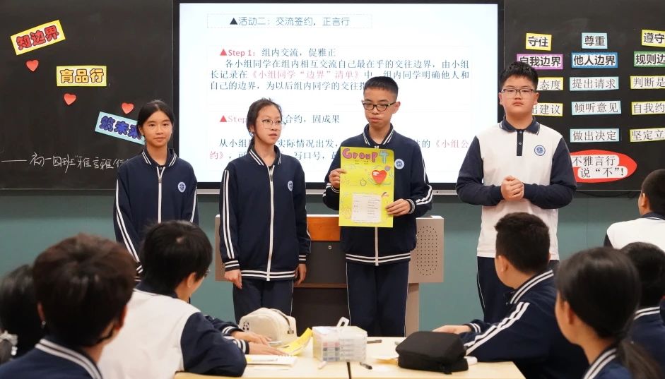 班会结束时,宋老师深情寄语,鼓励同学们守住自我边界,做独一无二的星辰;尊重他人边界,让友谊之花绽放;遵守规则边界,为未来铺就坦途。另外,宋老师还精心设计了文明礼仪之星评选、演讲比赛、社区宣传和开展家长公益课堂等主题活动,延伸活动效果。