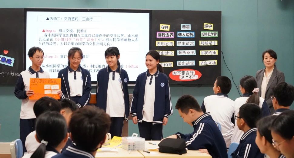 初一年级《知边界,育品行,筑未来》的主题班会,宋朝荟老师为同学们带来了一场别开生面的边界教育体验。班会在一系列引人深思的问题中开场,由“识边界、育边界和筑边界”三个环节组成。