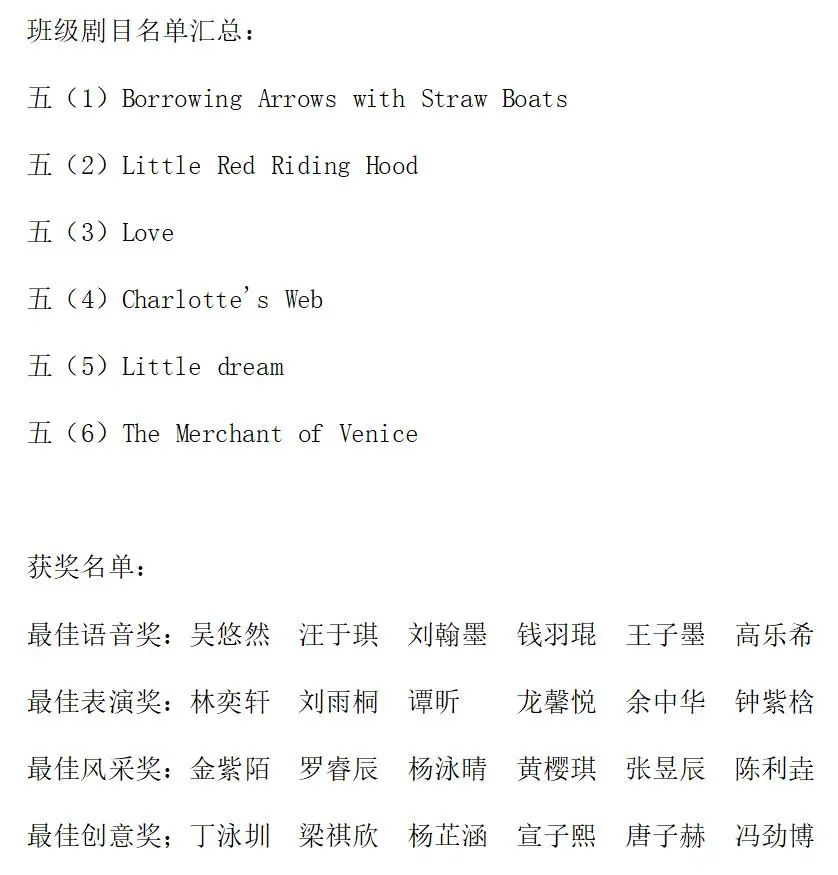 五(6)班带来的绘本剧是《The Merchant Of Venice》。在威尼斯的一座桥上,陈利垚扮演的Bassanio和冯劲博扮演的Antonio一起去找钟紫梒扮演 Shylock借钱求婚。Shylock提出,如果 Antonio没能及时还清债款,就要从他身上最接近心脏的地方割下一磅肉。最后,Bassanio求婚成功,Antonio却没能及时还清钱。高乐希扮演的Porsia帮助 Antonio赢得了官司,保住了性命。
