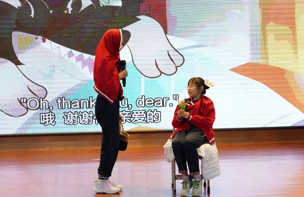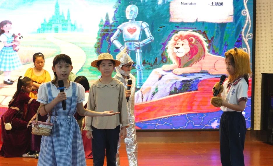 五(3)班的节目《Love》别具匠心。孩子们读完绘本并分享感受后,把《Tough Love》里后妈严厉的爱、《Nezha》里父母对孩子的疼爱、《The Wizard of Oz》里的友谊创编成一个故事。现场,小演员杨泳晴、谭昕饰演的母女娴熟地英文唱诵,通过投入的表演和富有感染力的情感表达,生动地展现了各自的性格特点和内心世界。刘翰墨同学饰演的哪吒,将委屈又愤怒的情绪诠释得十分到位,他与敖丙真挚情谊的升华更是赢得现场热烈的掌声。所有演员地道的英语口语,让观众们深深沉浸在英文绘本故事的精彩之中。