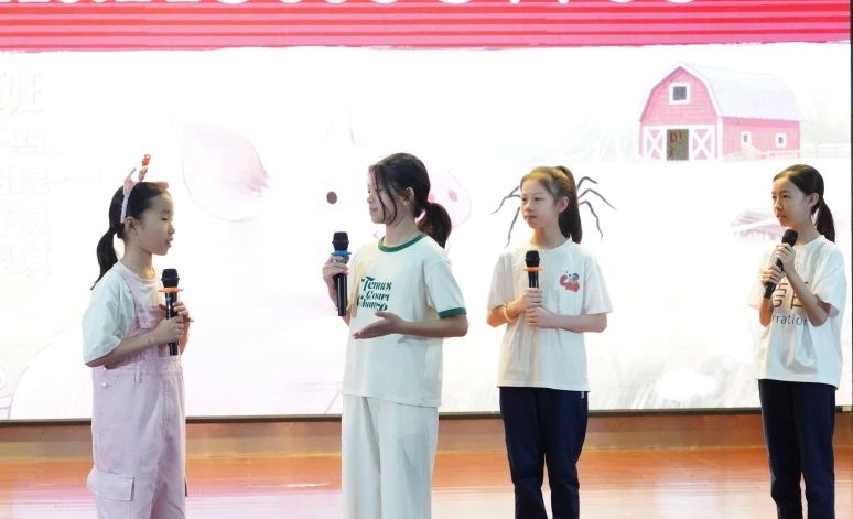 五(4)班的节目《Charlotte’s Web》由几个好朋友温情演绎一段经典友谊故事。旁白钱羽琨同学以优美的语言介绍着故事。孩子们细腻地展现着夏洛、威尔伯和小蜘蛛们开心生活在一起,互相帮助,共同分享农场生活的场景,展现出好朋友之间温馨而和谐的日常生活,美好的故事画面给观众们留下了深刻印象。