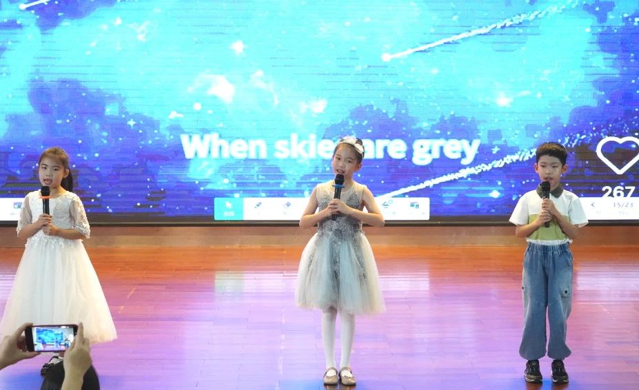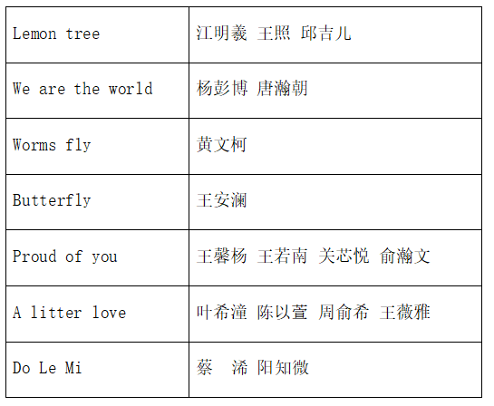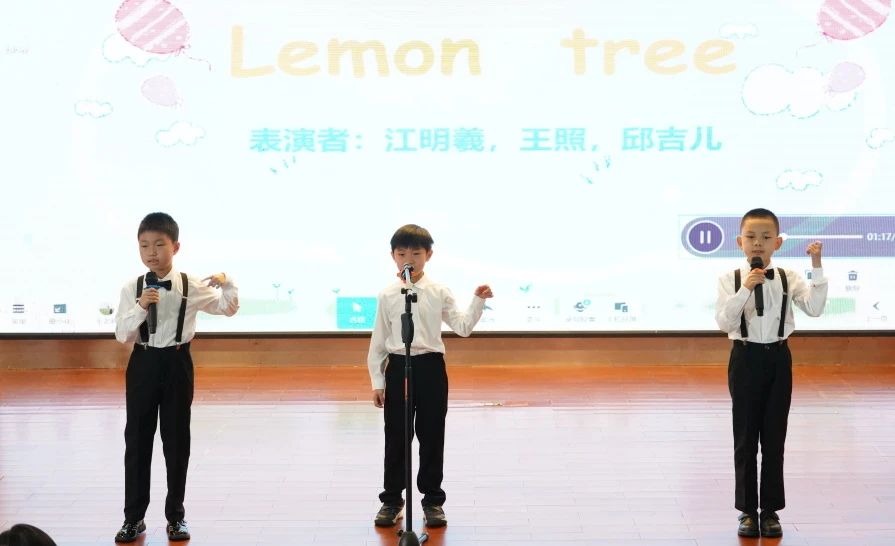 二(1)班歌曲串烧节目《A little love and yesterday once more》 ,欧阳雨若、赵梓清用她们甜美的嗓音,将这两首经典英文歌曲完美融合,展现了非凡的演唱实力。节目《Lemon tree》 中,江明羲、王照、邱吉儿以清新自然的演唱风格,将这首充满活力的歌曲演绎得淋漓尽致,赢得了观众的阵阵掌声。