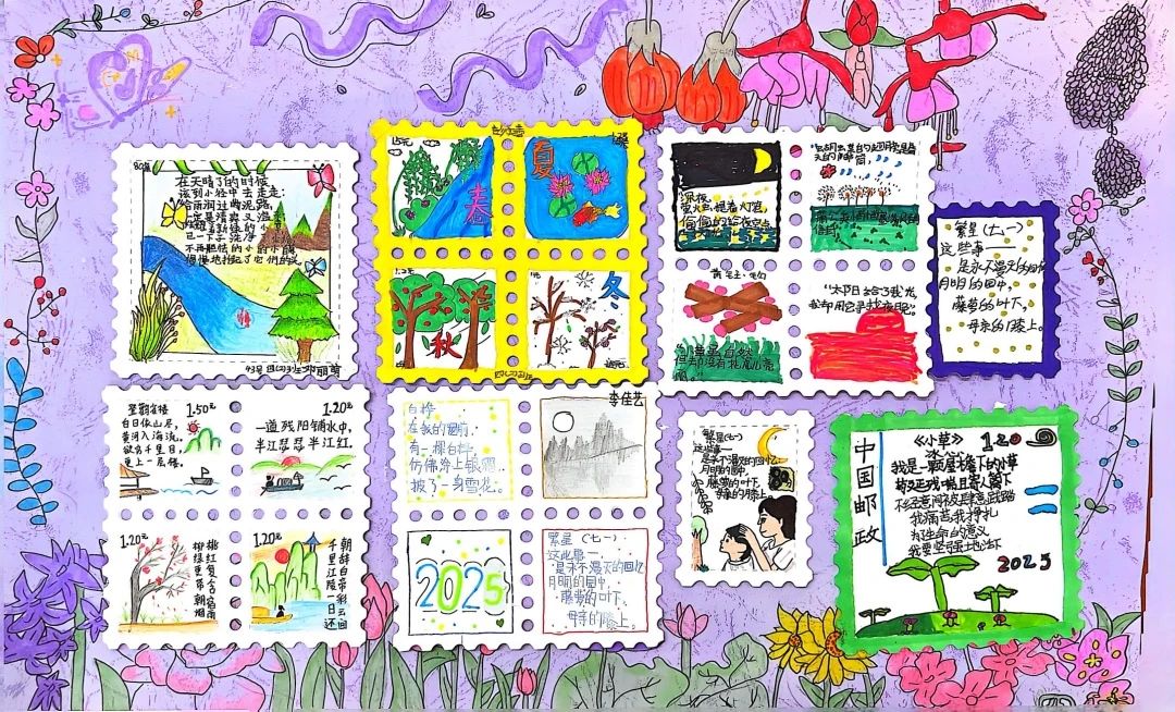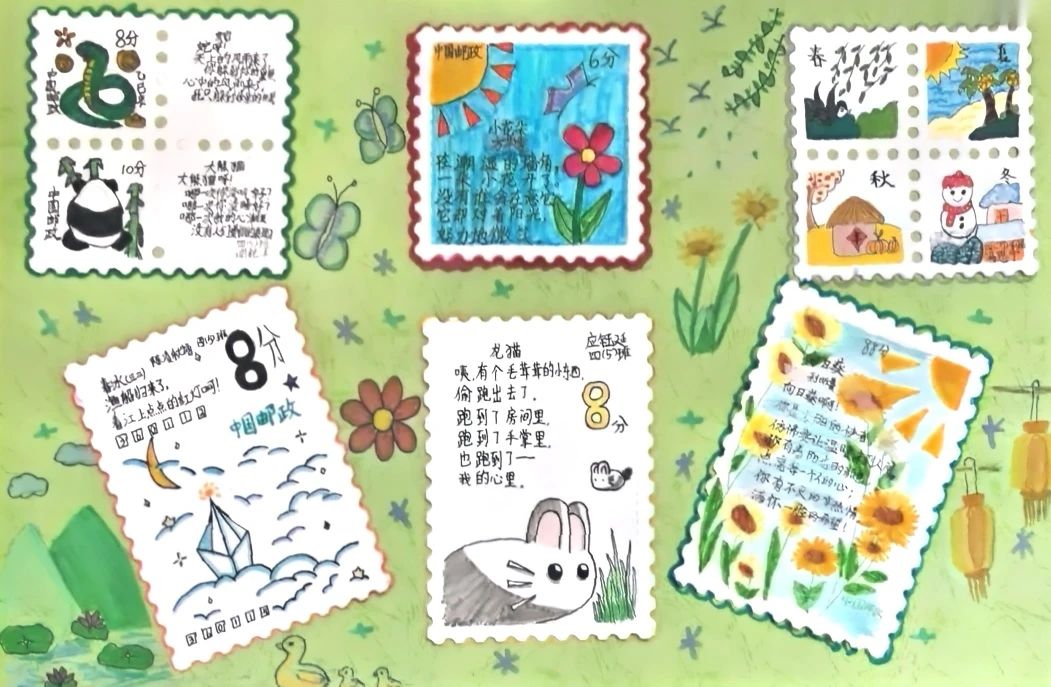 自2025年4月7日读书节拉开帷幕,四年级全体学生便满怀热忱地投身于这场充满创意与文化底蕴的活动之中。此次活动独出心裁地将邮票艺术与诗歌创作深度融合,以笔墨勾勒童心,用方寸展现万象,为师生们带来了一场跨越时空的文化盛宴。
