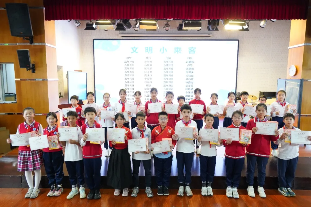 文明是一缕春风,温暖校园的每一个角落;榜样是一盏明灯,照亮崇德向善的成长之路。节目展演后,激动人心的颁奖环节如期而至。主持人依次宣读了五1至五6班“文明小乘客”获奖名单,20余名同学凭借良好的乘车礼仪与文明素养获此荣誉。课程教学中心刘欣副主任、教师发展中心聂芹副主任上台为获奖同学颁发荣誉证书,每一张奖状,都是对同学们文明行为的肯定与嘉奖。