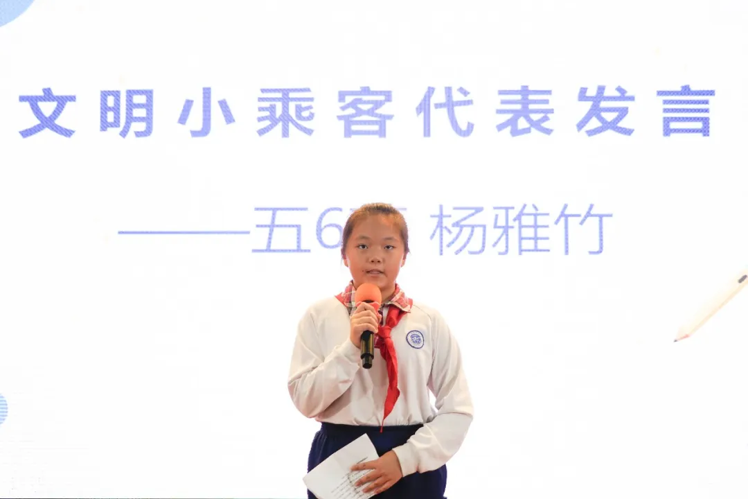 颁奖结束后,“文明小乘客”代表——五6班杨雅竹同学上台发言。她结合自身经历,真诚分享了文明乘车心得,诠释了文明的内涵,并号召大家以榜样为标杆,从身边小事做起,争做文明有礼的新时代好少年。