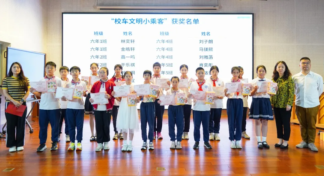 表演结束后,进入备受期待的颁奖环节。学校对在日常校园生活中表现突出的“校车文明小乘客” 进行了集中表彰,获奖同学依次上台领奖,脸上洋溢着自豪的笑容。学生发展中心主任唐龄,副主任吴芳和六年级级长吴悦为获奖同学颁奖并表示祝贺。此次表彰不仅是对获奖同学的肯定与鼓励,更树立了身边的榜样,激励全体同学向先进学习,自觉践行文明规范。