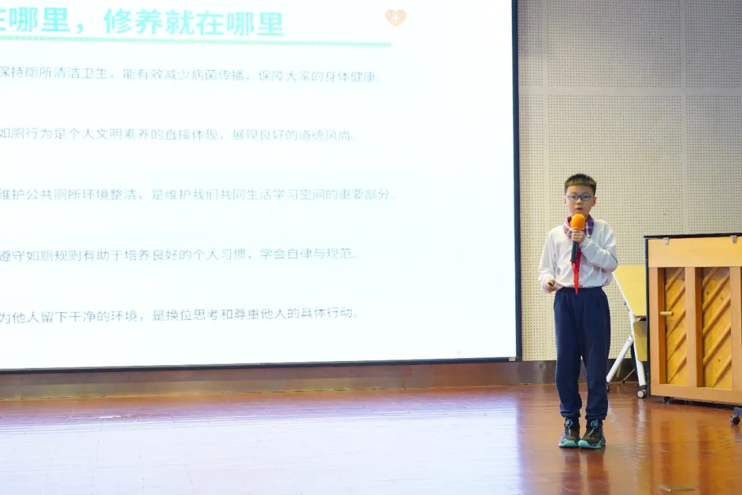 在热烈的氛围中,六(2)班林思齐同学带来主题演讲《文明如厕》。他结合校园生活实际,用通俗易懂的语言讲解了文明如厕的具体要求与重要性,倡导大家从细节做起,养成卫生整洁的良好习惯,让文明渗透到校园生活的每一个角落。